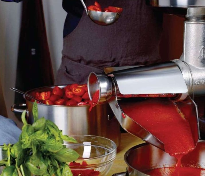 Una volta tagliati e preparati gli ingredienti, si procede con la fase cruciale della trasformazione. CFadda mette a disposizione attrezzature robuste e ad alte prestazioni pensate per garantire un risultato professionale anche nelle lavorazioni casalinghe. Lo spremipomodoro manuale, realizzato in alluminio alimentare, è dotato di una solida morsa di fissaggio per il piano di lavoro e di una coclea interna che consente di separare efficacemente bucce e semi, producendo una passata fine e omogenea. L’ampia tramoggia e il beccuccio inclinato favoriscono un flusso continuo, riducendo gli sprechi e aumentando la produttività.