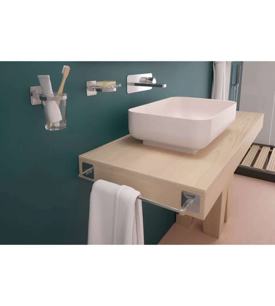 Porta asciugamani a parete in acciaio cromato, dimensioni 50,3x6,2x5,3 cm. Struttura solida e resistente, design elegante e moderno, adatto a ogni stile di arredo bagno. Fissaggio biadesivo o con viti. Completa il tuo set con accessori coordinabili.