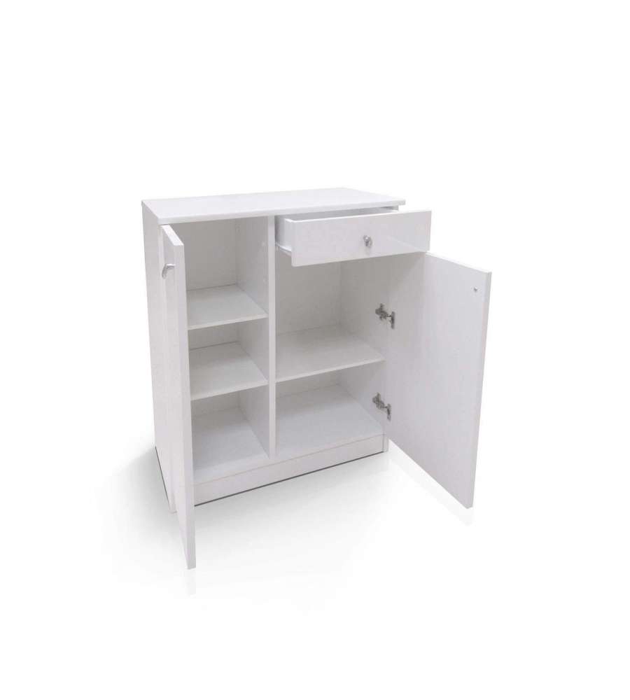Mobile doppio bianco laccato lucido con 2 ante, 1 cassetto e 3 ripiani. Dimensioni: 59 x 34 x 80 cm. Montaggio: pomelli e viti inclusi.Made in Italy: