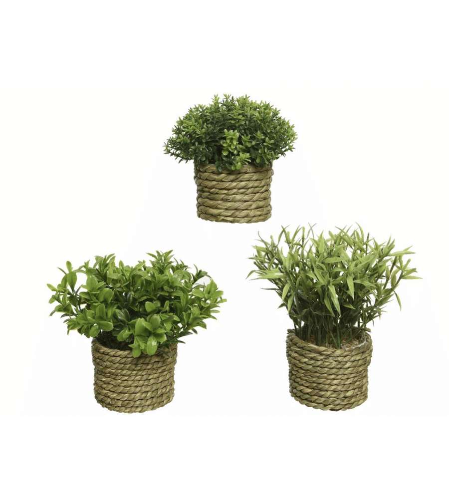 Pianta artificiale verde in vaso intrecciato, dimensioni compatte Ø 16 x 13 cm, realizzata in plastica resistente. Ideale per decorare interni ed esterni, disponibile in tre varianti. Non richiede manutenzione.Materiale struttura: