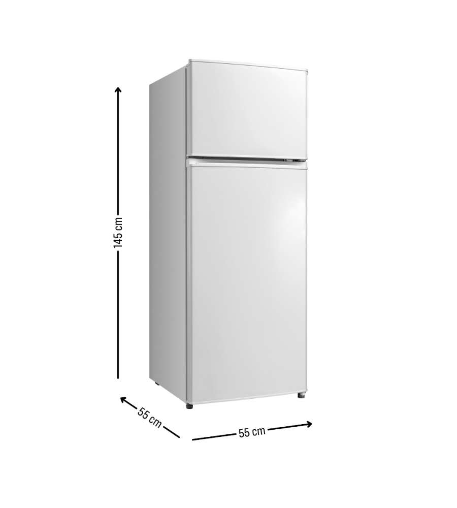 Frigorifero a doppia porta Daya con capacità totale di 204L, classe E, controllo elettronico e funzione Super Cooling. Design compatto e silenzioso (40 dB), 3 ripiani in vetro, porte reversibili e luce LED interna. Efficienza e praticità garantite.Capacità: