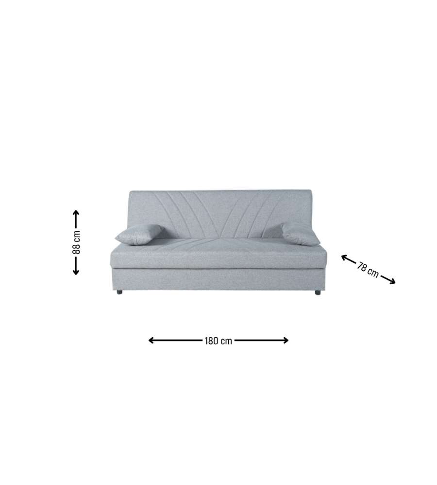 Divano letto Domo Mea Fiji 3 posti, grigio chiaro. Design moderno senza braccioli, schienale ribaltabile per trasformazione in letto (180x105 cm). Cassettone integrato per spazio extra. Tessuto resistente e facile da pulire. Dimensioni: 180x78x88 cm.Altezza seduta: