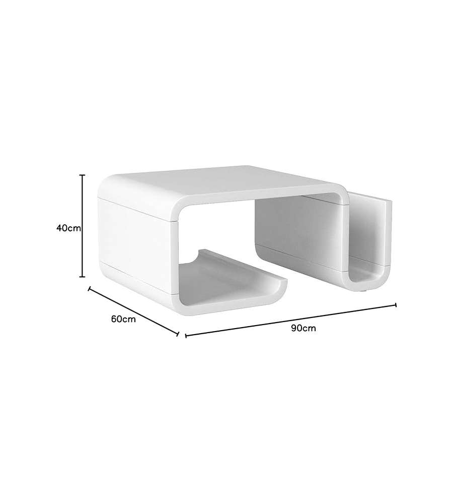 Tavolino moderno in MDF bianco, dimensioni 90 x 60 x 40 cm, ideale per soggiorni e uffici. Facile da montare, pesa solo 25 kg, combinando stile e funzionalità. Perfetto per portare relax, si integra perfettamente in qualsiasi ambiente.