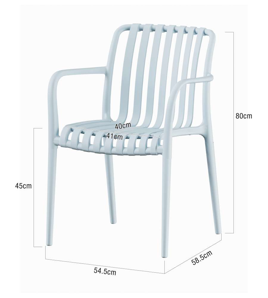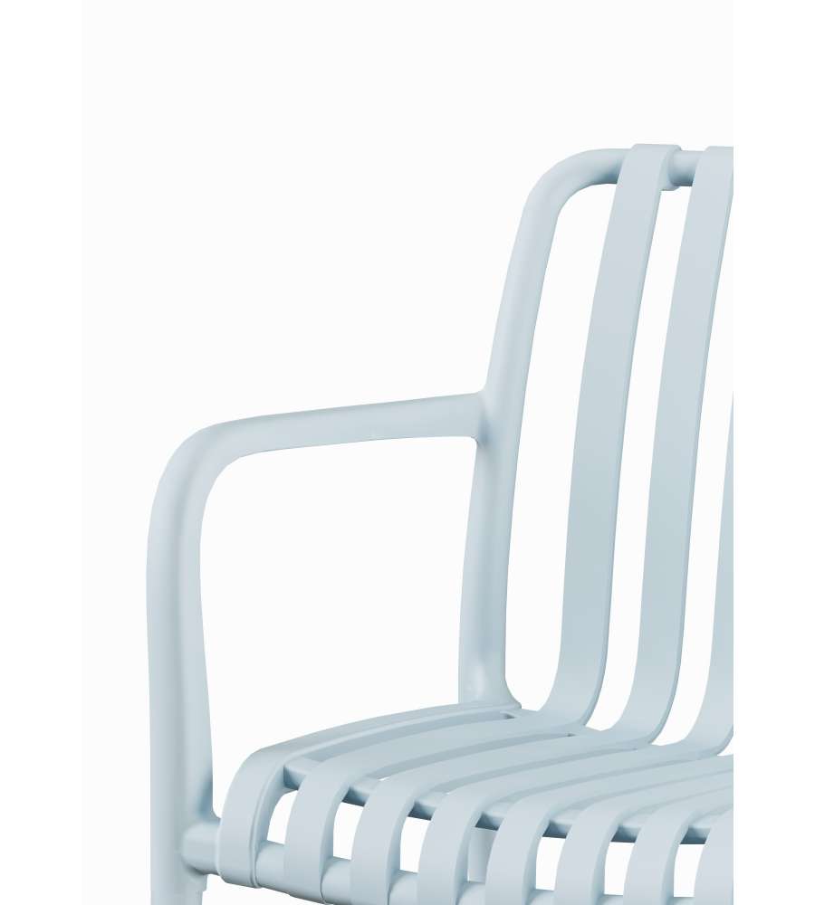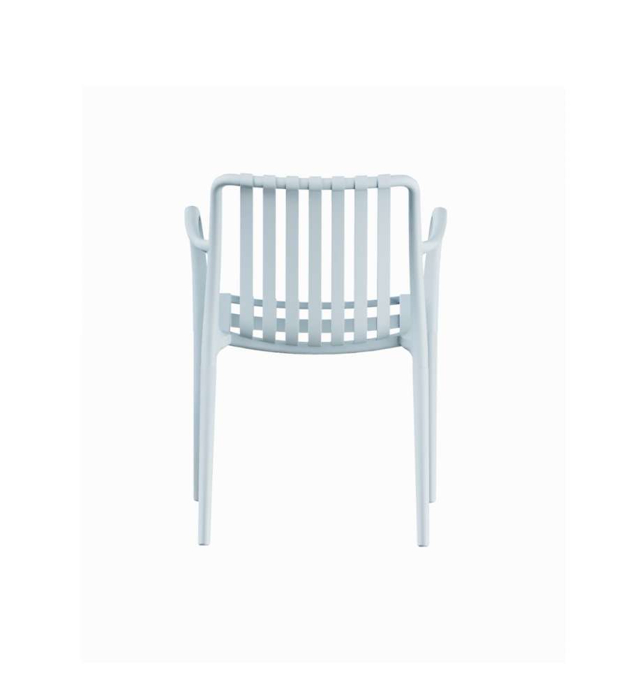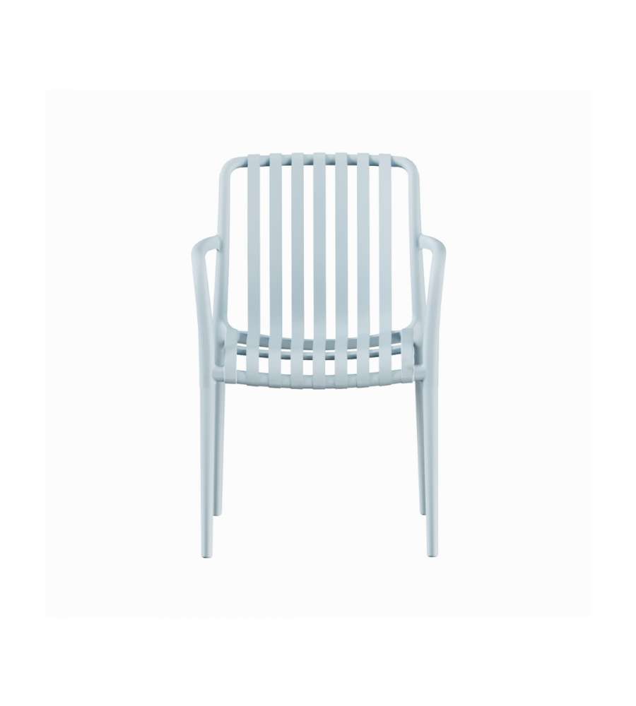Descrizione: Sedia da esterno impilabile in polipropilene azzurro, resistente e lavabile. Design moderno con doghe e braccioli integrati, perfetta per terrazzi, giardini e locali.