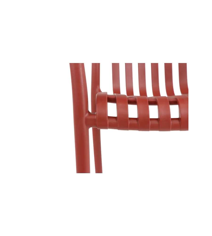 La Sedia Breeze rossa di Domo Mea, dal design moderno italiano, è realizzata interamente in polipropilene di qualità superiore, resistente a intemperie e raggi UV. Ideale per uso esterno e ambienti contract come bar, hotel e ristoranti, offre una seduta comoda e confortevole grazie al design ergonomico con schienale alto e doghe verticali. Leggera e impilabile, consente un facile spostamento e una comoda conservazione quando non utilizzata.