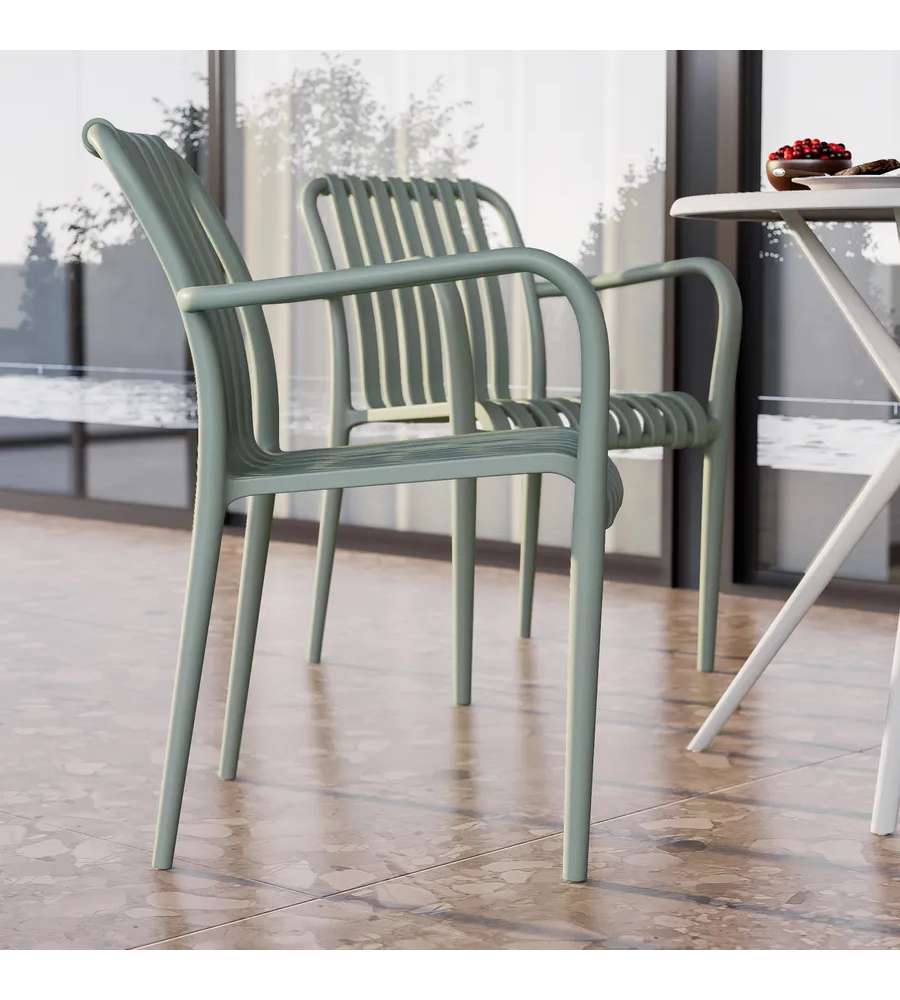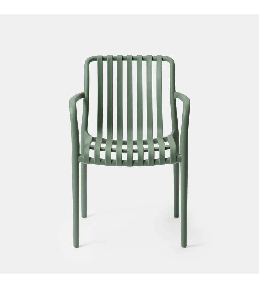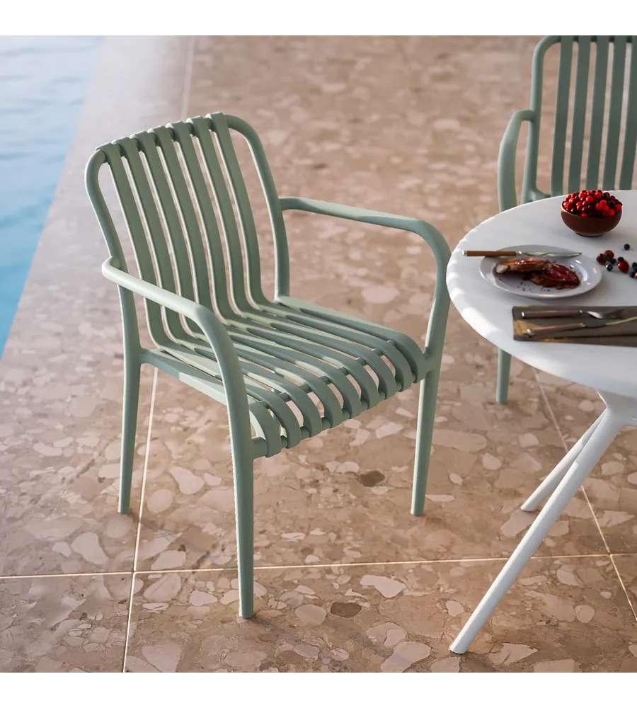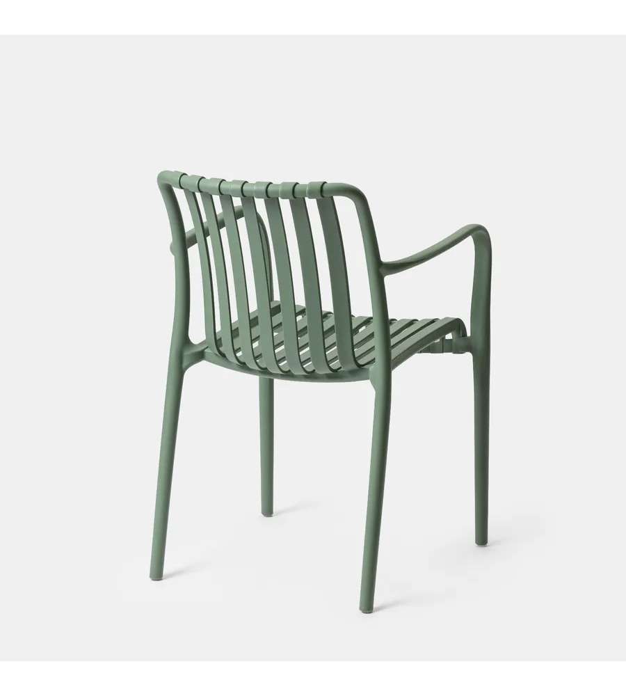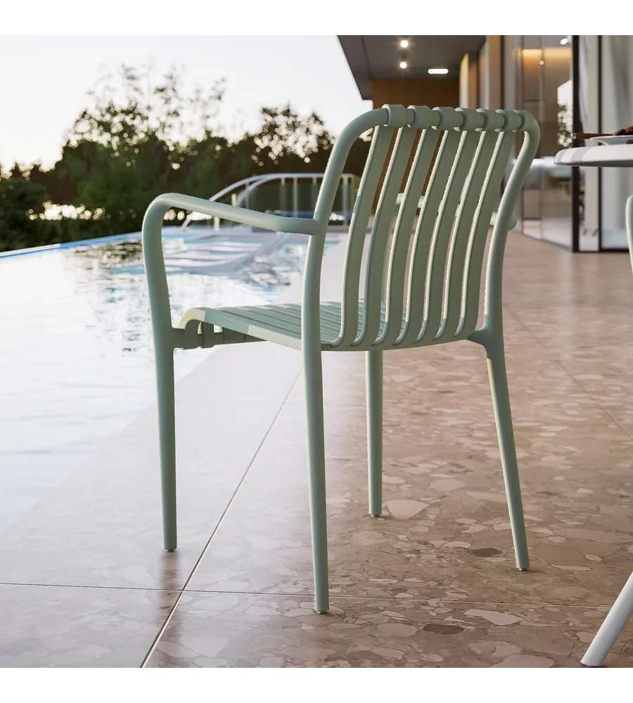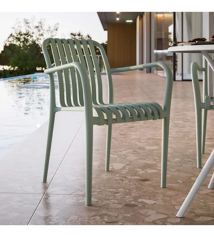 Descrizione: Sedia da esterno impilabile in polipropilene verde salvia, resistente e lavabile. Design moderno con doghe e braccioli integrati, perfetta per terrazzi, giardini e locali.
