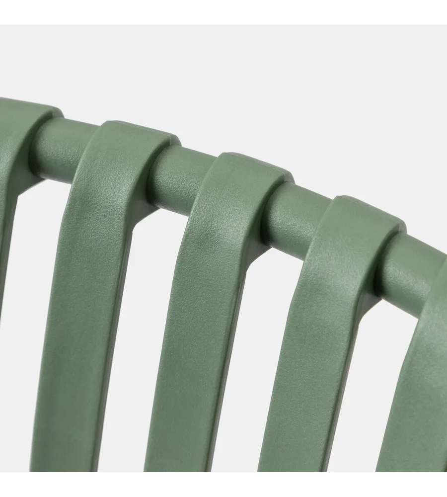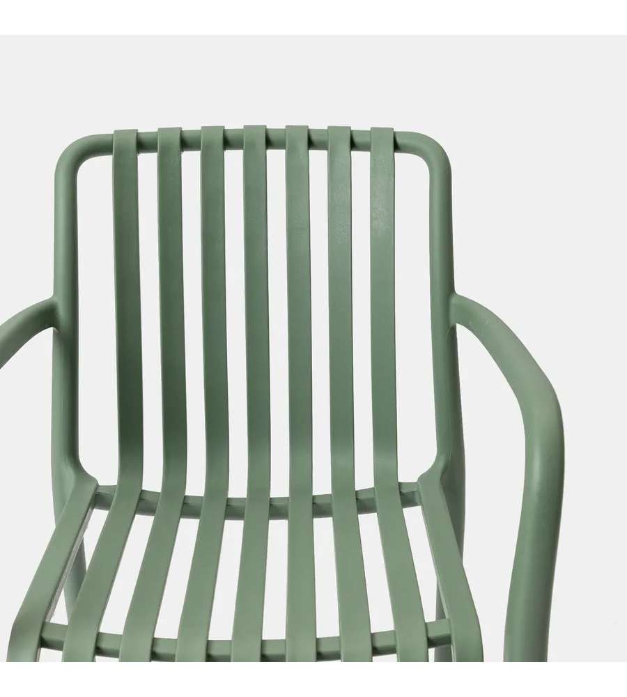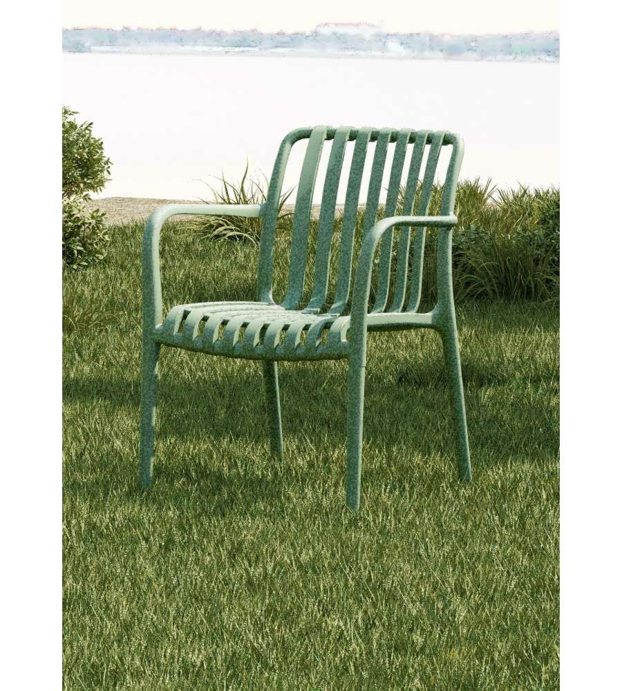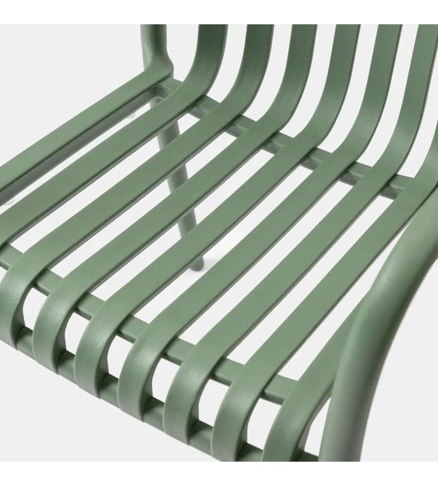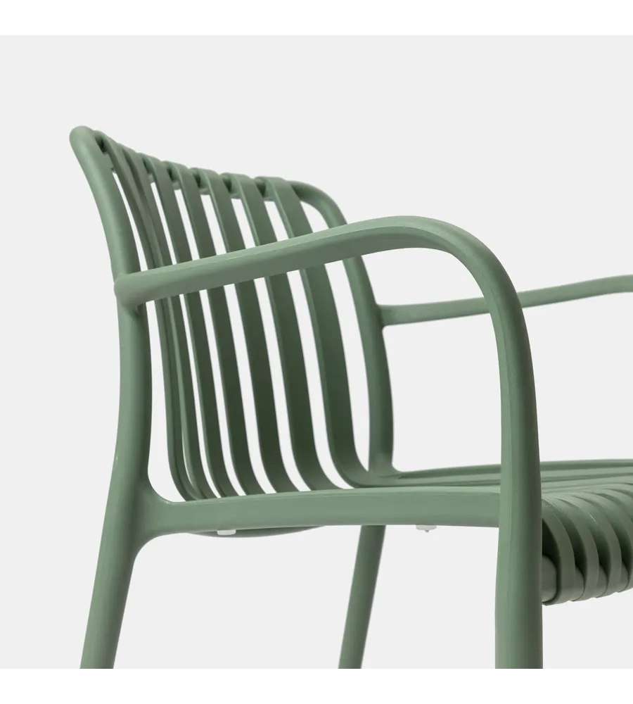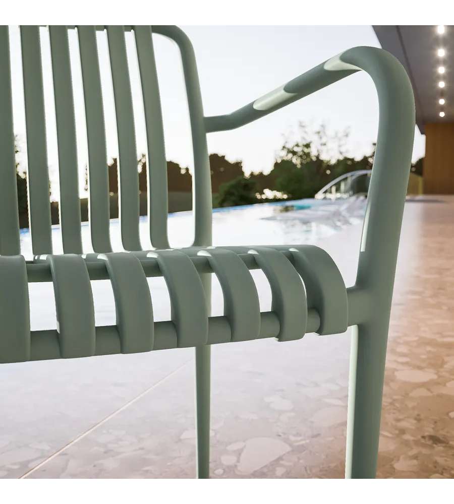 Descrizione: Sedia da esterno impilabile in polipropilene verde salvia, resistente e lavabile. Design moderno con doghe e braccioli integrati, perfetta per terrazzi, giardini e locali.
