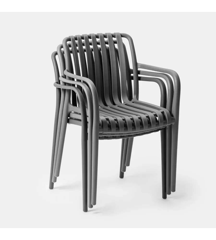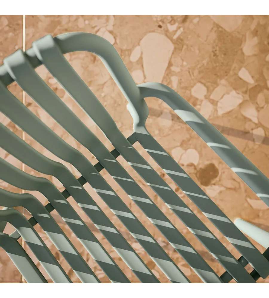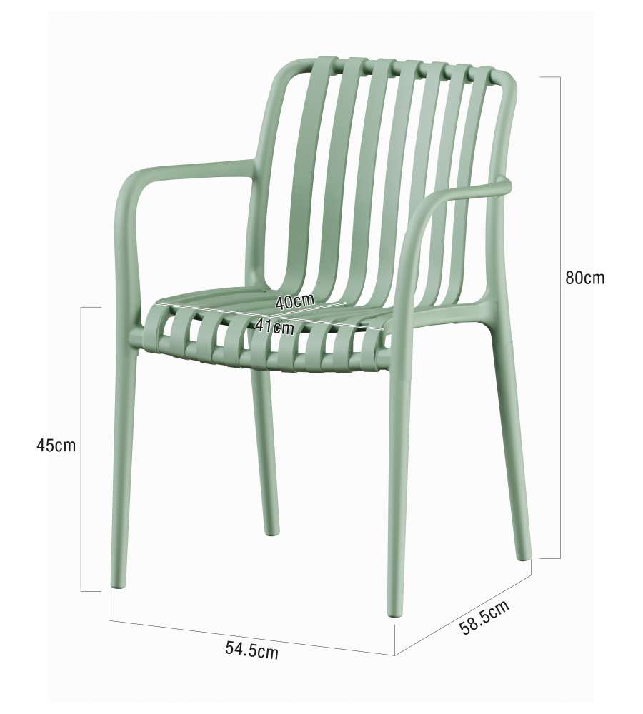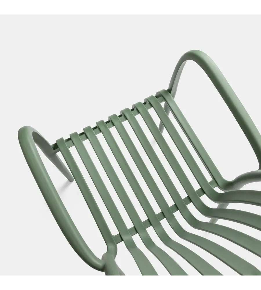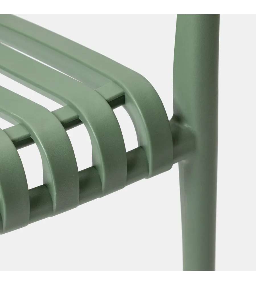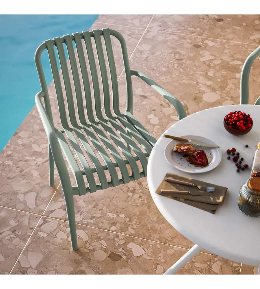 Descrizione: Sedia da esterno impilabile in polipropilene verde salvia, resistente e lavabile. Design moderno con doghe e braccioli integrati, perfetta per terrazzi, giardini e locali.