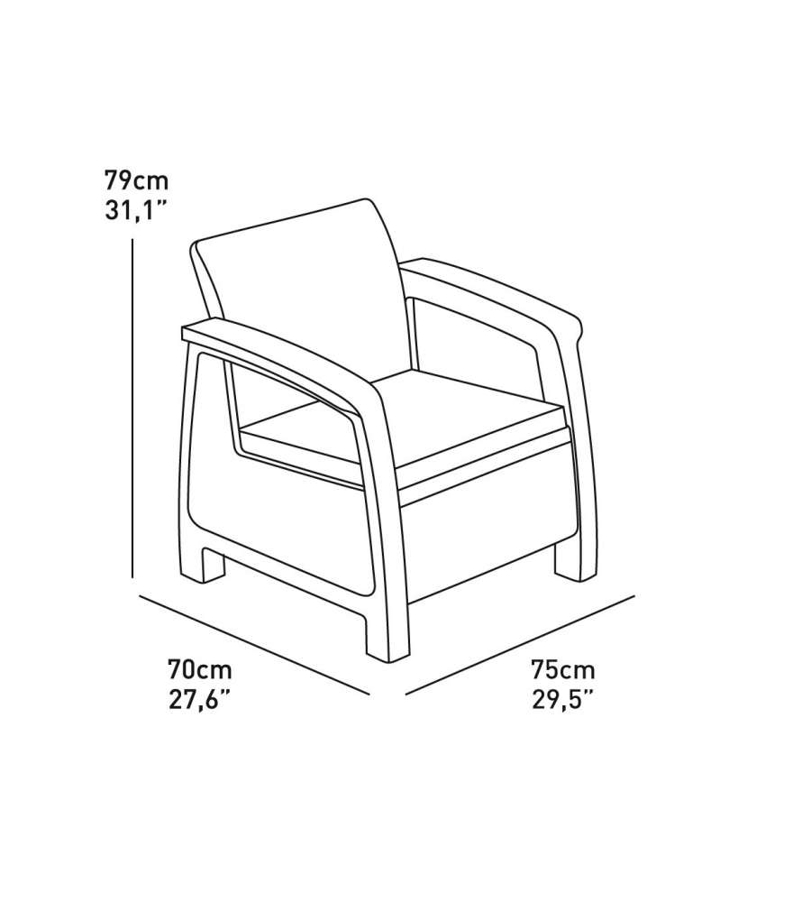 Poltrone 75x75x79 cm. Divano 128x70x79 cm. Tavolino 77x57x42 cmMateriale: