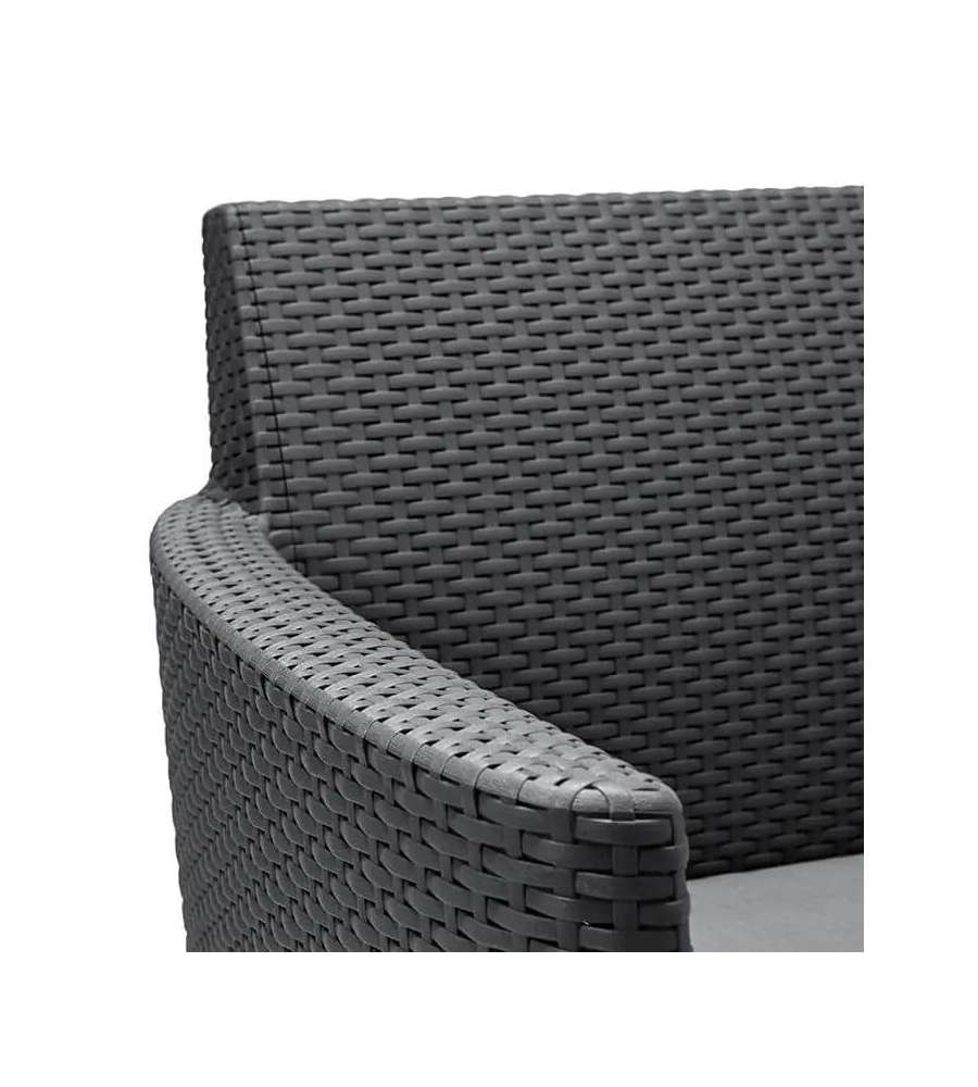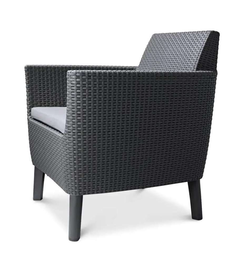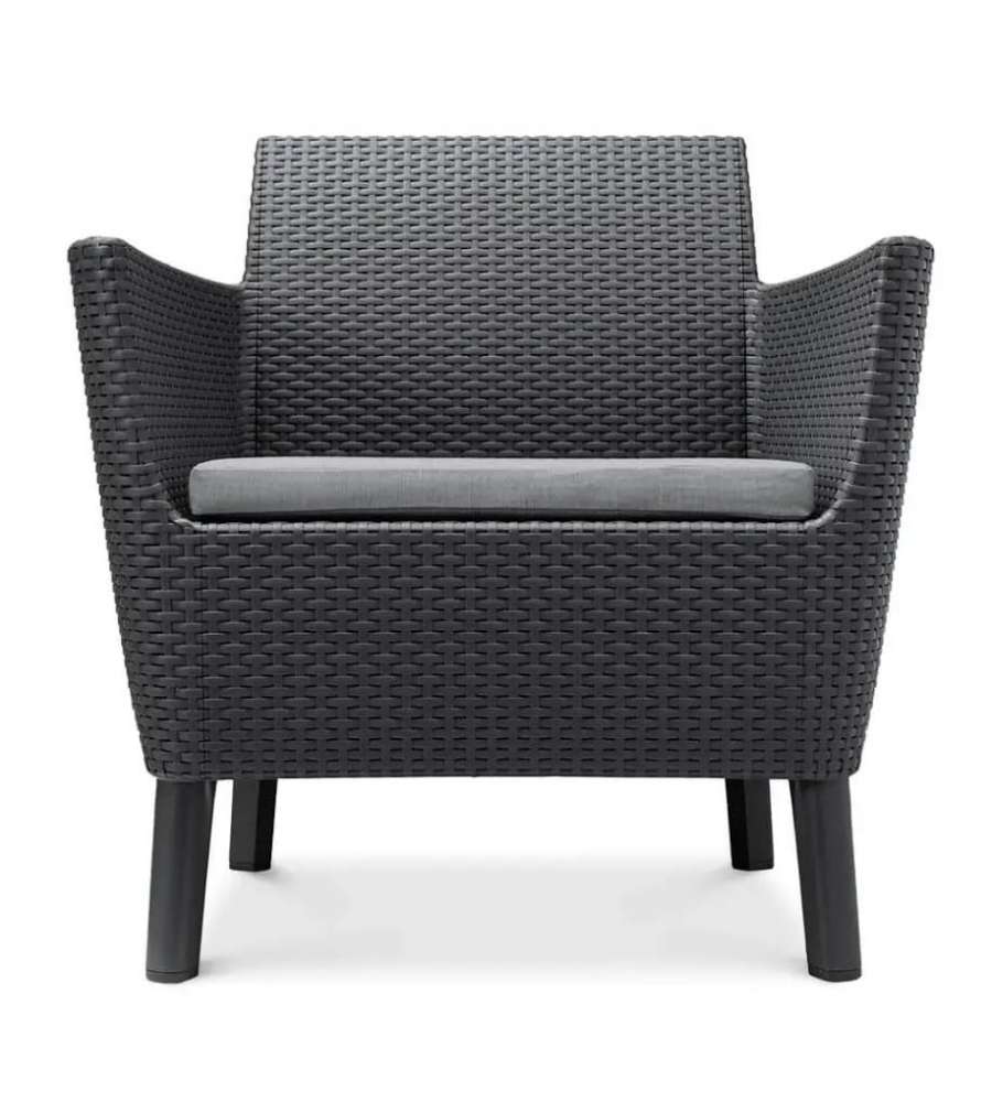 Descrizione: Set Lounge Salemo della Keter composto da: 1 Divano a due posti, 2 Poltrone ed un tavolino contenitore. Design di ispirazione scandinava, trama in rattan, cuscini per seduta compresi.
