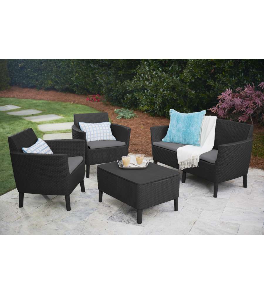 Set Lounge Salemo Keter: include 1 divano a due posti, 2 poltrone, tavolino contenitore. Design scandinavo, trama rattan, cuscini inclusi. Resina resistente, montaggio semplice.Uso esterno:
