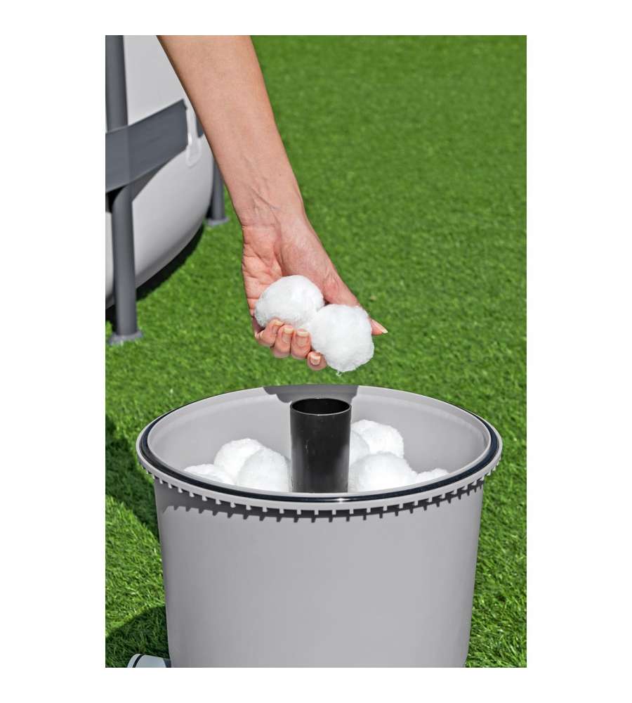 Sabbia NON inclusa, richiesta sabbia silicea n. 20, 0.45-0.85 mm, circa 8.5 kg; funziona anche con le sfere filtranti Polysphere di BestwayDotazione: