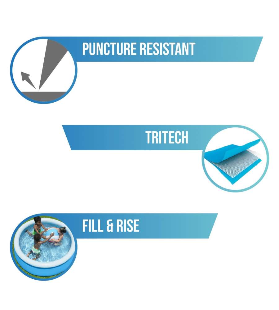 Piscina Fast Set Bestway, 183 x 51 cm, capacità 940 litri, pareti in PVC triplo strato, ideale per giardino e terrazzo. Colore blu e bianco.Capacità: