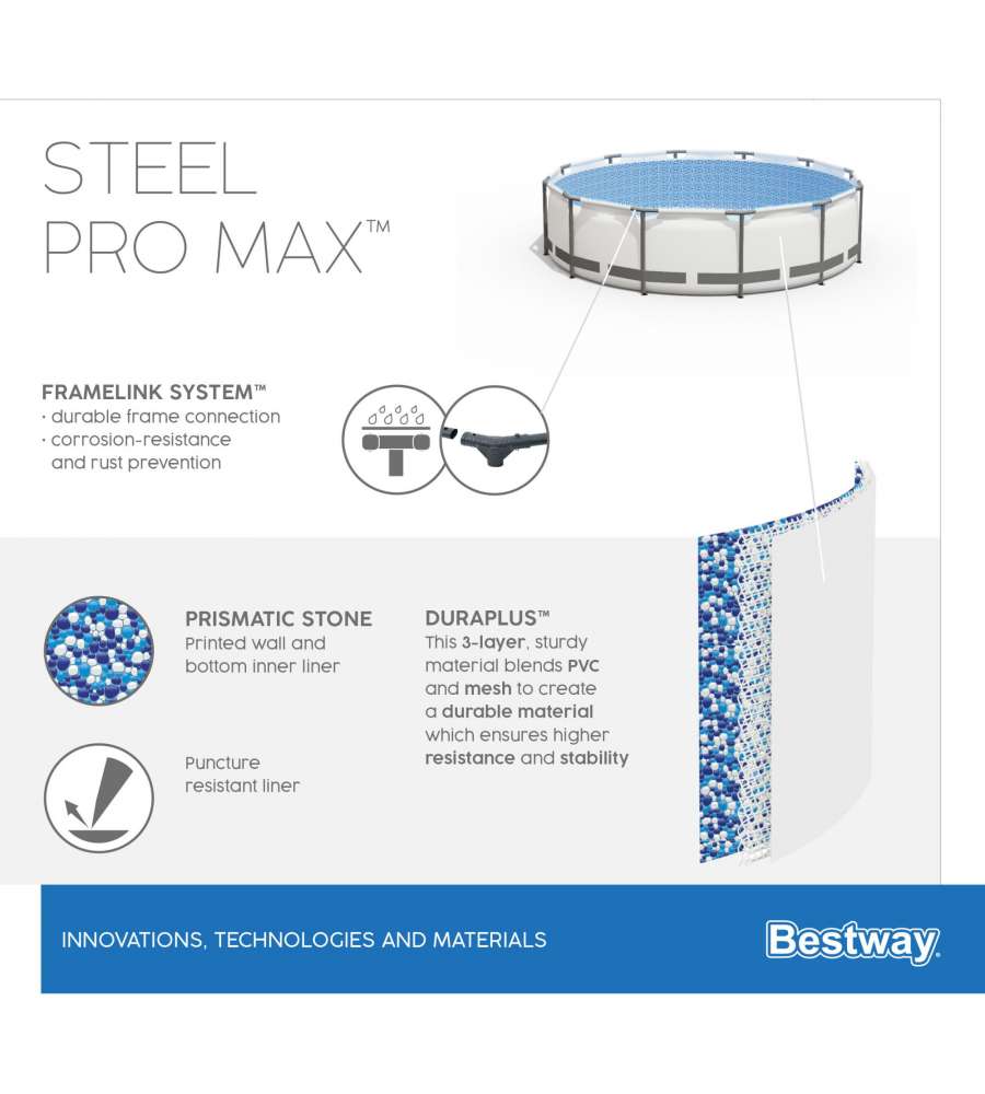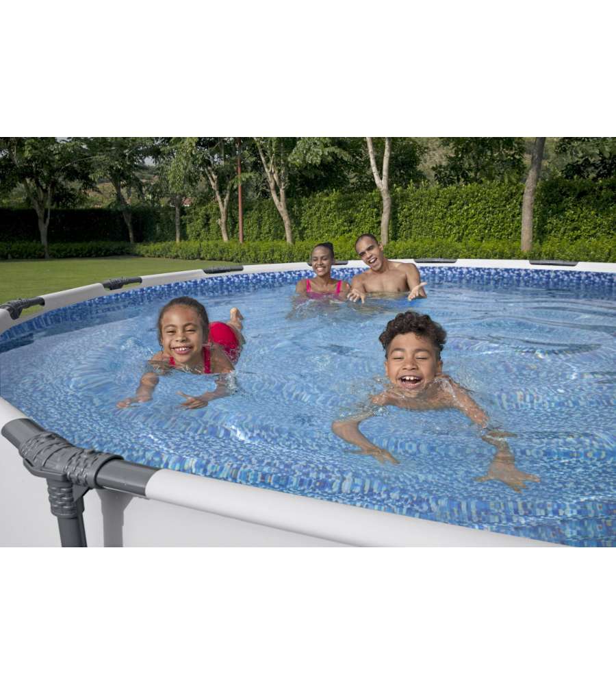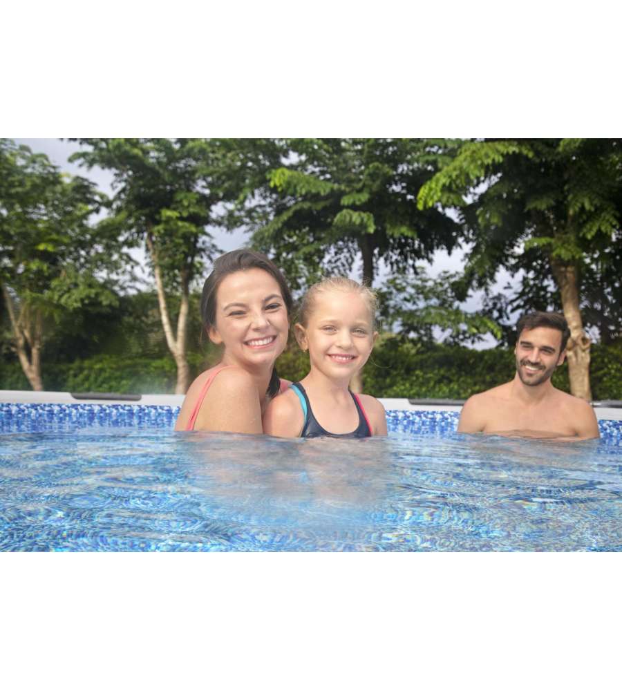 Piscina Bestway rotonda Ø 366 x 76 cm, telaio in acciaio, pareti in PVC. Include pompa filtro e cartuccia. Capacità: 6.473 litri.Capacità: