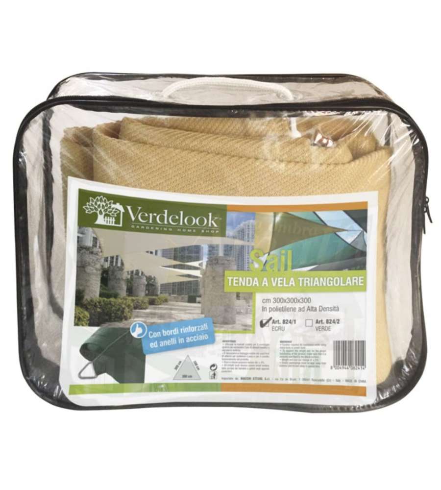 Vela ombreggiante triangolare, 3x3x3 m, in poliestere 200 g, colore ecrù, resistente ai raggi UV. Include 3 corde da 5 m e sacca per il trasporto.Materiale copertura: