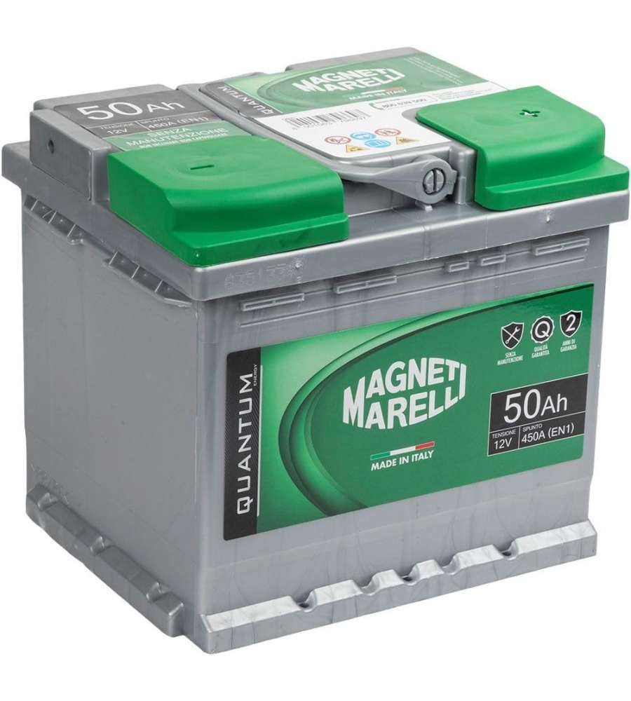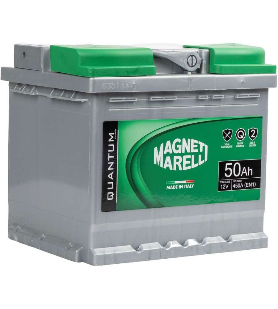 Batteria auto Magneti Marelli Quantum 50 Ah, 450A di spunto, pronta all'uso e senza manutenzione. Resistente a temperature fino a -18°, 2 anni di garanzia. Dimensioni: 20,7x17,5x19h cm. Tecnologia al piombo. Ideale per auto.Volt: