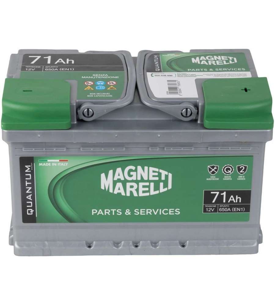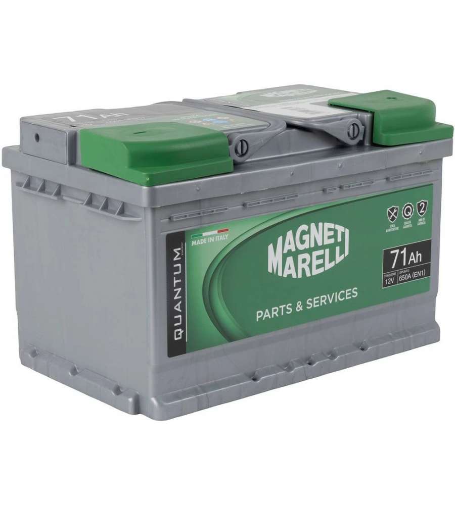 Batteria auto Magneti Marelli Quantum 71Ah, 12V, 650A, pronta all'uso e senza manutenzione. Testata a -18°, garantisce avviamento sicuro e prestazioni elevate. Capacità ottimale per una lunga durata e resistenza al freddo.Volt: