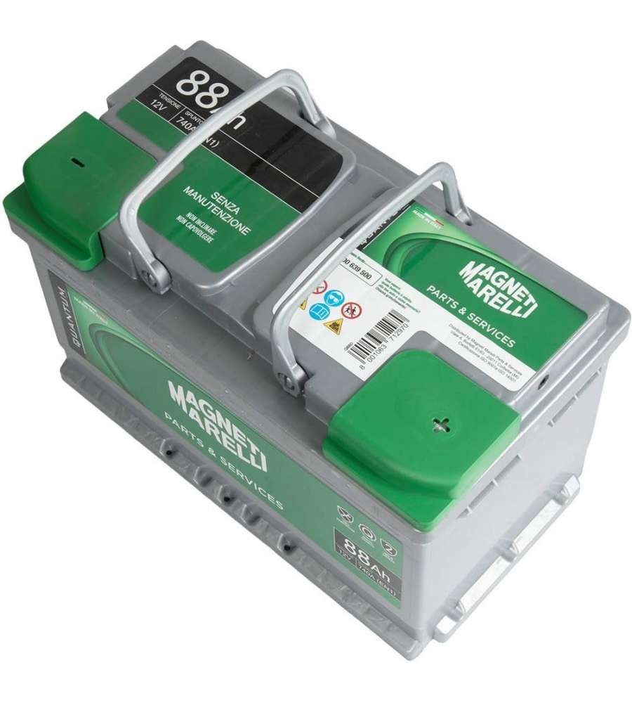 Batteria auto Magneti Marelli Quantum 88Ah 12V 740A, pronta all'uso e senza manutenzione. Testata per temperature fino a -18°. Dimensioni compatte (31x17.5x19 cm), ideale per avviamenti sicuri in condizioni avverse. Cassetta L4.Volt: