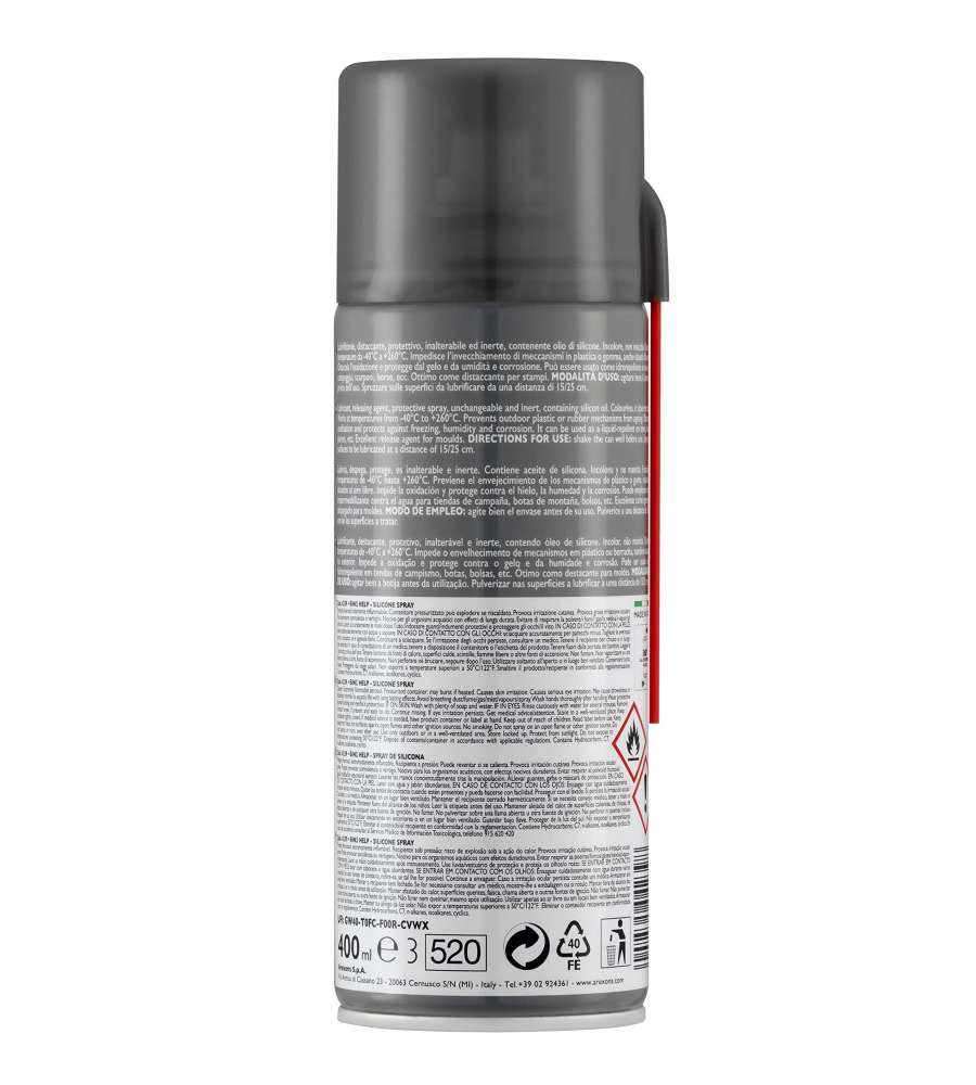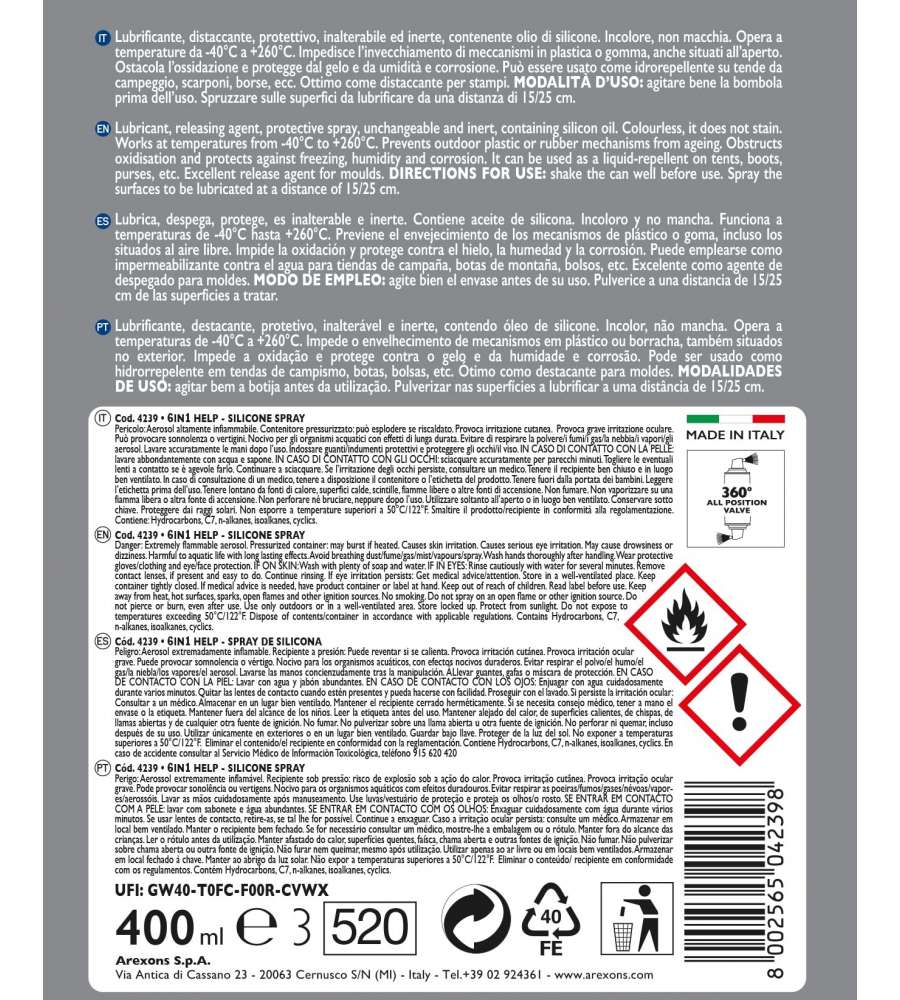 Descrizione: Arexons Help Silicone Spray 6 in 1 da 400ml: lubrifica, protegge e impermeabilizza. Adatto anche per plastica e gomma. Resistente a umidità e temperature estreme (da -40 a +260°C), crea un film protettivo che previene ossidazione e invecchiamento.