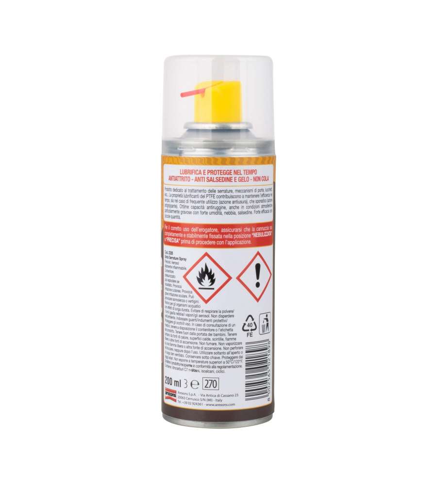 Lubrificante Svitol Arexons spray da 200 ml, incolore e inodore. Contiene PTFE per ridurre attrito e resistere a umidità e corrosione. Erogazione a 360°, ideale per serrature e cerniere. Protegge e allunga la vita dei meccanismi.Destinazione d'uso: