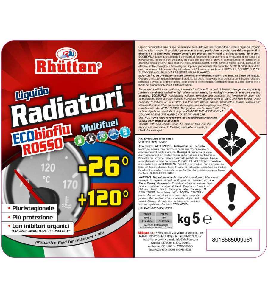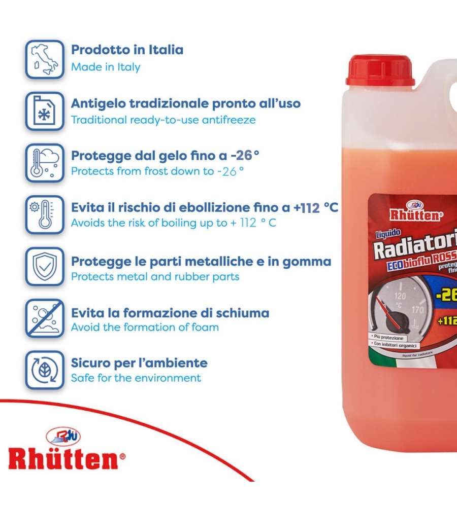 Il liquido radiatori Rhutten Ecobioflu Rosso rappresenta una soluzione efficace per garantire la massima protezione ai circuiti di raffreddamento dei motori. Grazie alla sua formulazione avanzata con inibitori organici, questo prodotto non solo previene la corrosione e la formazione di incrostazioni, ma è anche sicuro per i componenti in alluminio e leghe leggere. Pronto all'uso, il liquido può essere versato direttamente nella vaschetta, senza necessità di diluizioni. Con una protezione efficace fino a -26°C e un'ottima capacità di resistere a temperature di ebollizione fino a +120°C, si tratta di un alleato indispensabile in ogni stagione, per garantire il corretto funzionamento del motore e prolungare la vita del radiatore.
