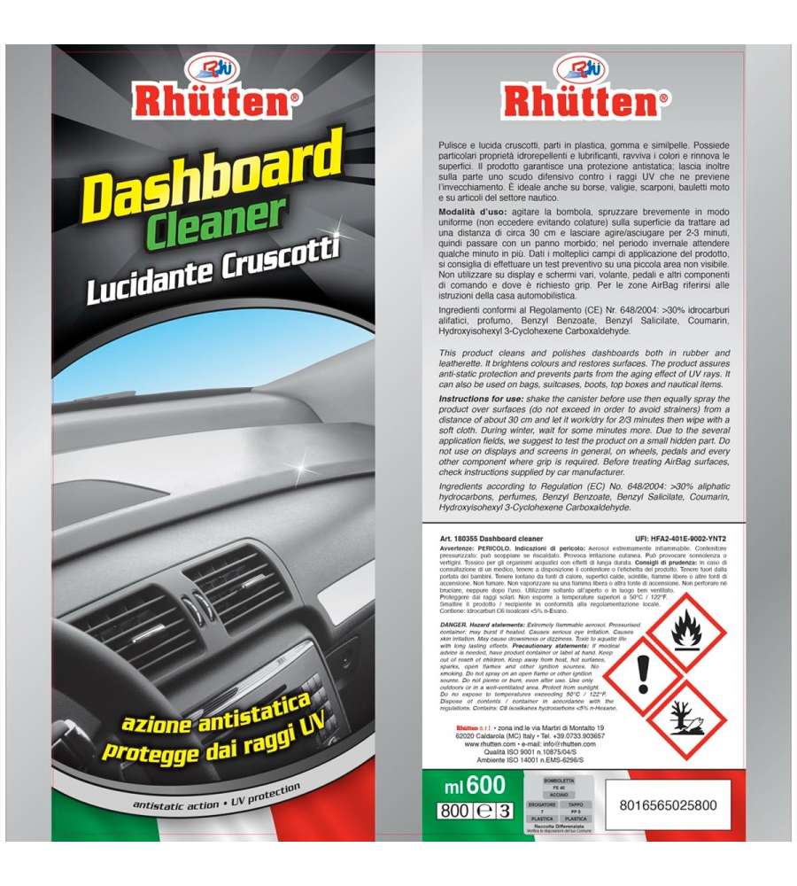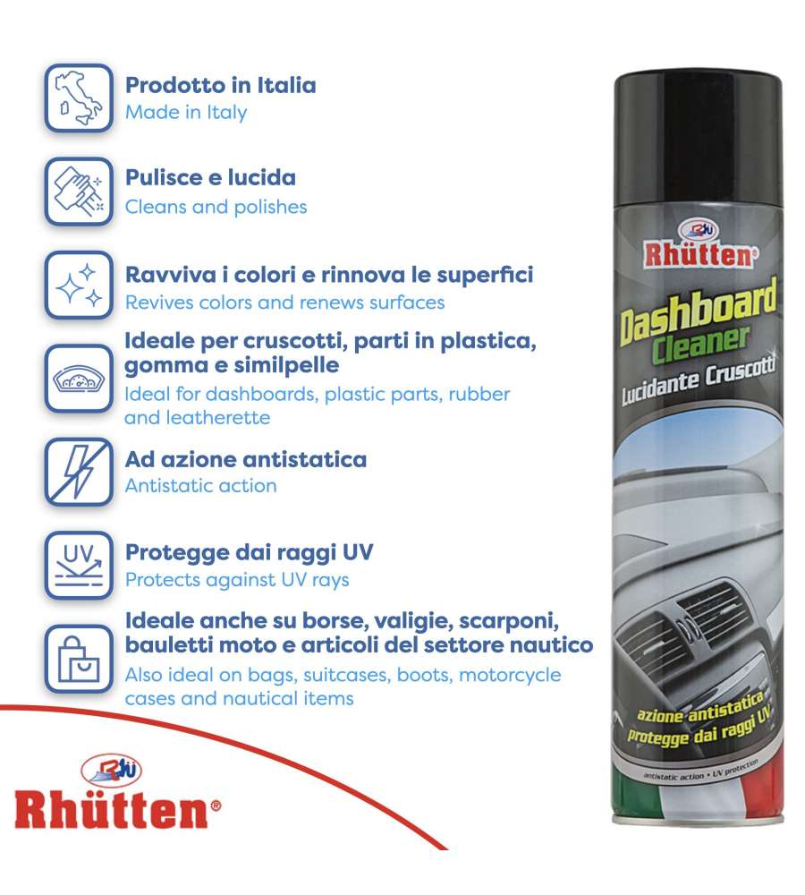 Detergente cruscotti spray da 600 ml con effetto lucido e protettivo. Pulisce, lucida e rinnova superfici in plastica, gomma e similpelle. Protezione antistatica e UV, idrorepellente, ideale anche per articoli nautici.Confezione: