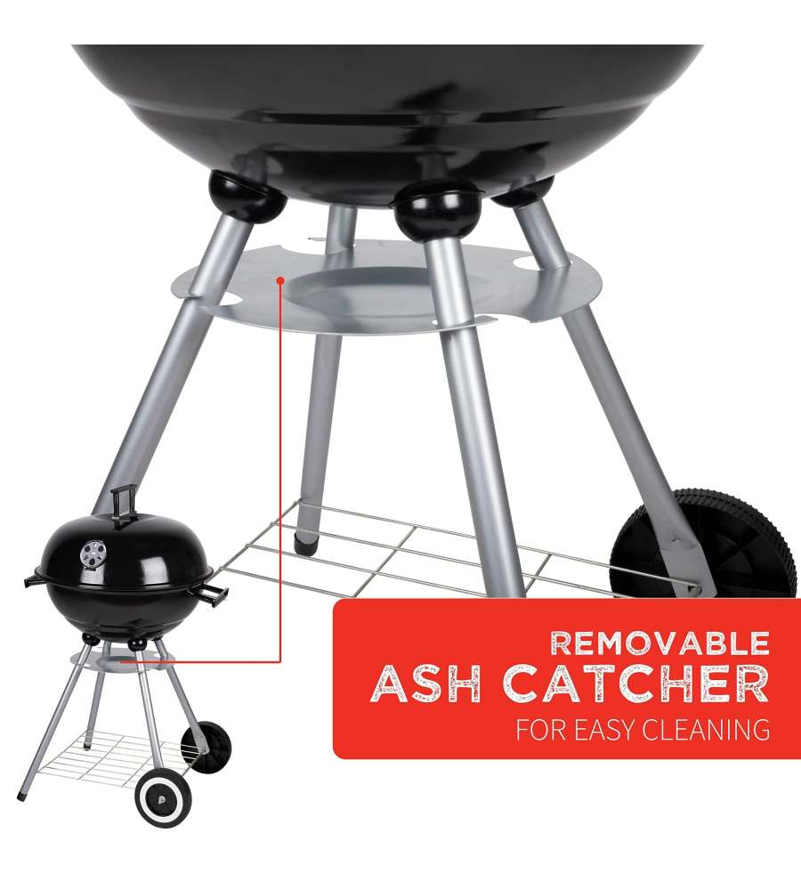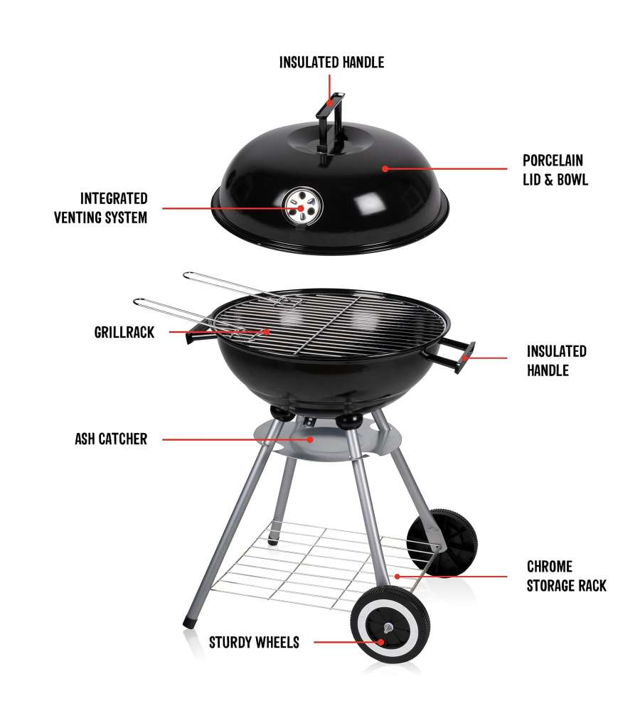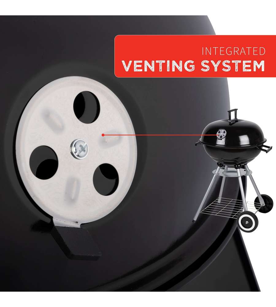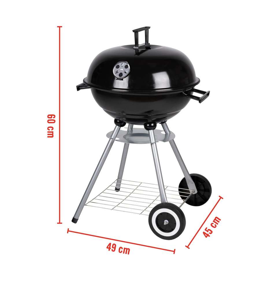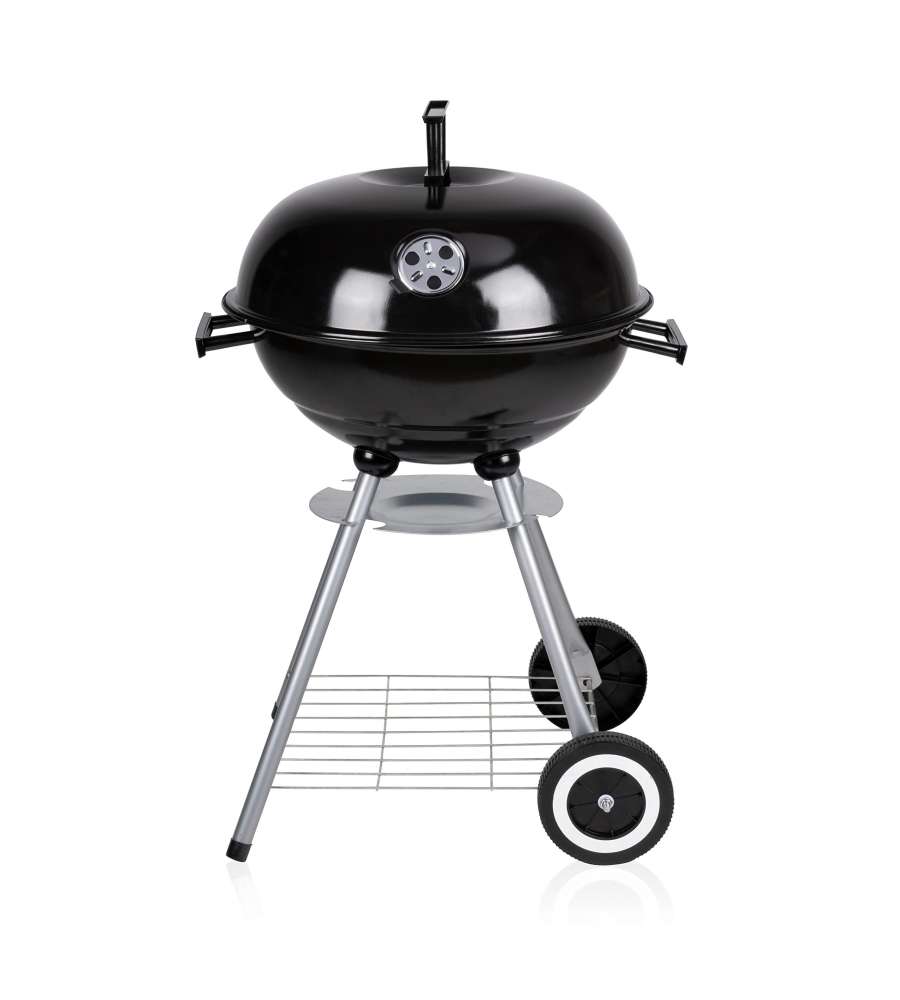 Barbecue tondo con struttura in acciaio, griglia cromata di 45 cm, sfiato regolabile, vassoio per grassi e ripiano in metallo. Dotato di ruote per un facile spostamento, ideale per cotture all'aperto. Peso 5,04 kg.Dimensioni area cottura: