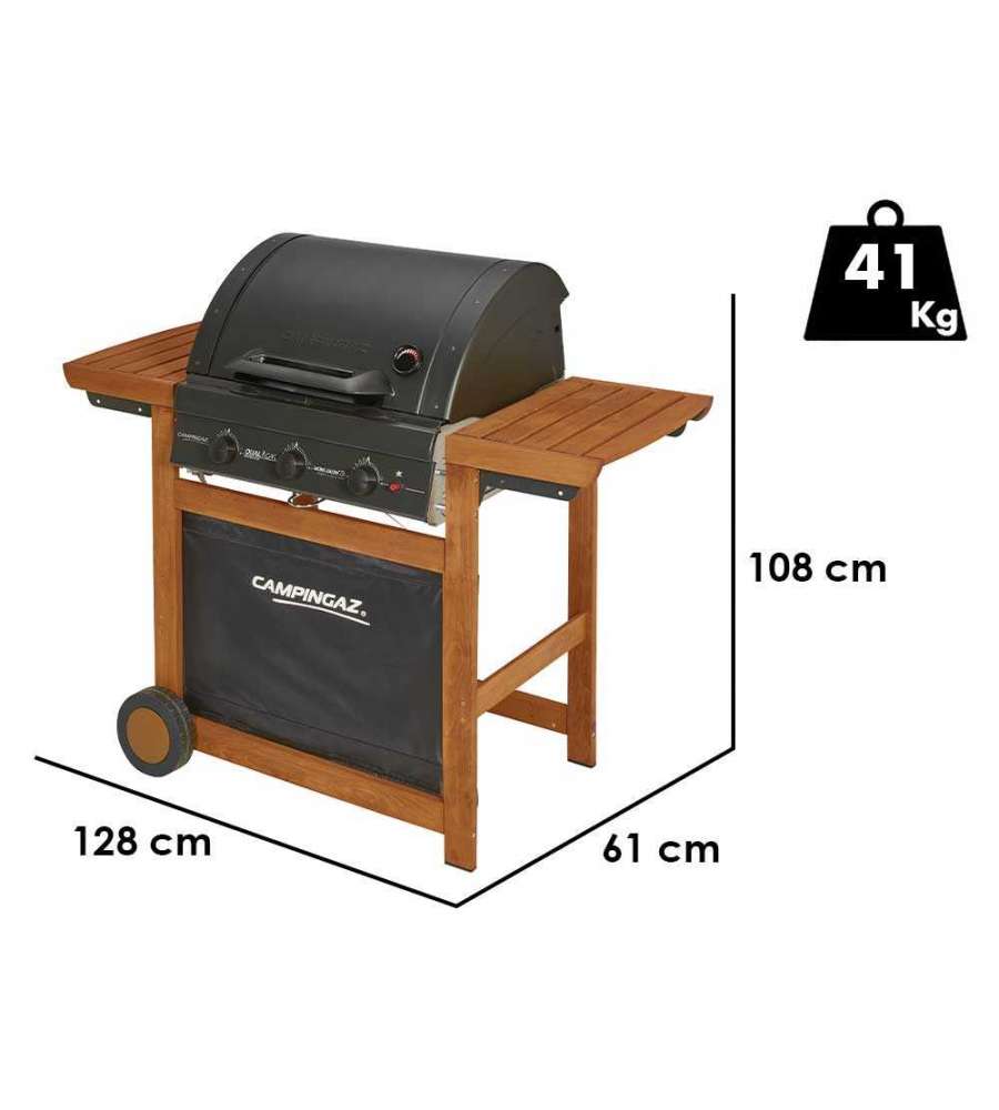 Descrizione: Barbecue a gas metano/GPL con 3 bruciatori, griglia e piastra in ghisa smaltata, carrello in legno, ripiani laterali e termometro. Made in Italy.