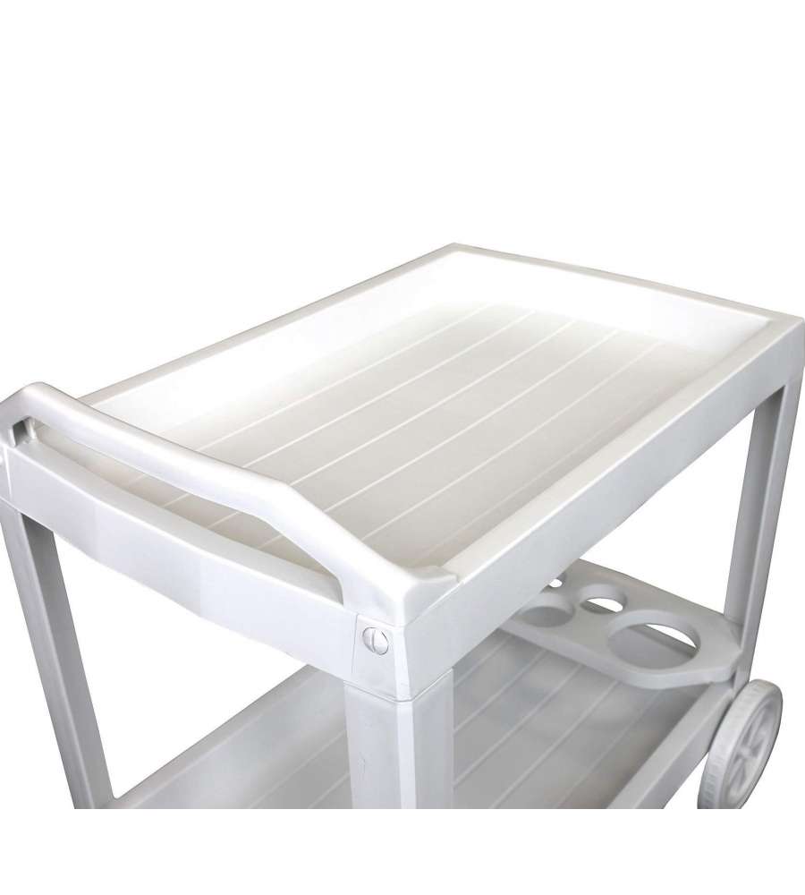 Carrello in resina bianca per bibite, dimensioni 74x53x73 cm, leggero (7,1 kg) e resistente agli agenti atmosferici, muffe e polvere. Dotato di ruote per facilità di movimento, non adatto a uso professionale. Montaggio richiesto.Uso esterno: