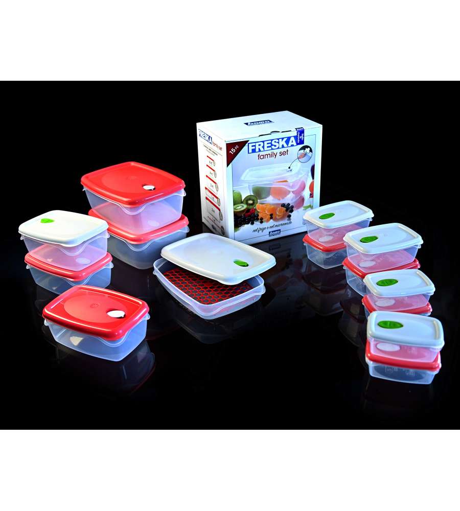 Set di contenitori per alimenti in plastica Bama Freska, composti da diverse capacità (0,5Lt a 5Lt) con coperchio ermetico. Lavabili in lavastoviglie, adatti per microonde e freezer. Design rettangolare.Richiudibile: