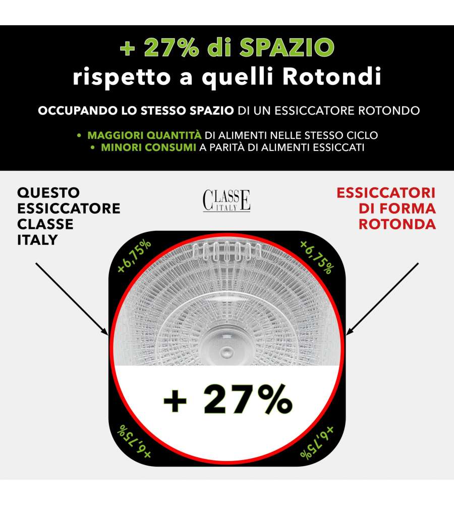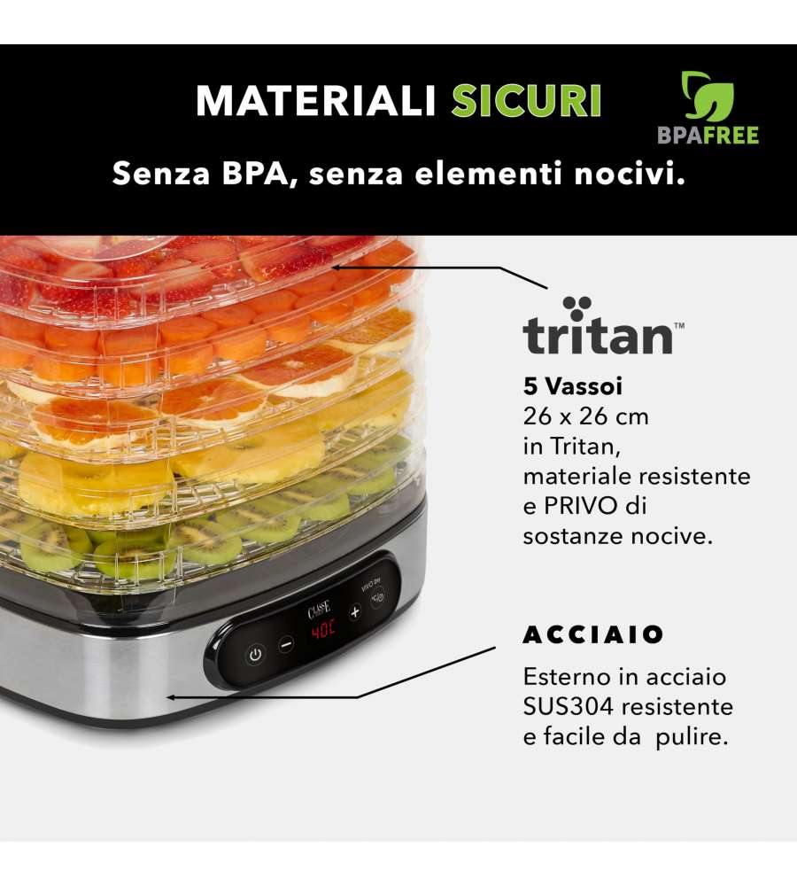 Essiccatore Verticale Dry V Vivo: 500W, struttura in acciaio, 5 cassetti in plastica regolabili (2/4 cm), termostato con display digitale, ideale per funghi, frutta, verdura.
