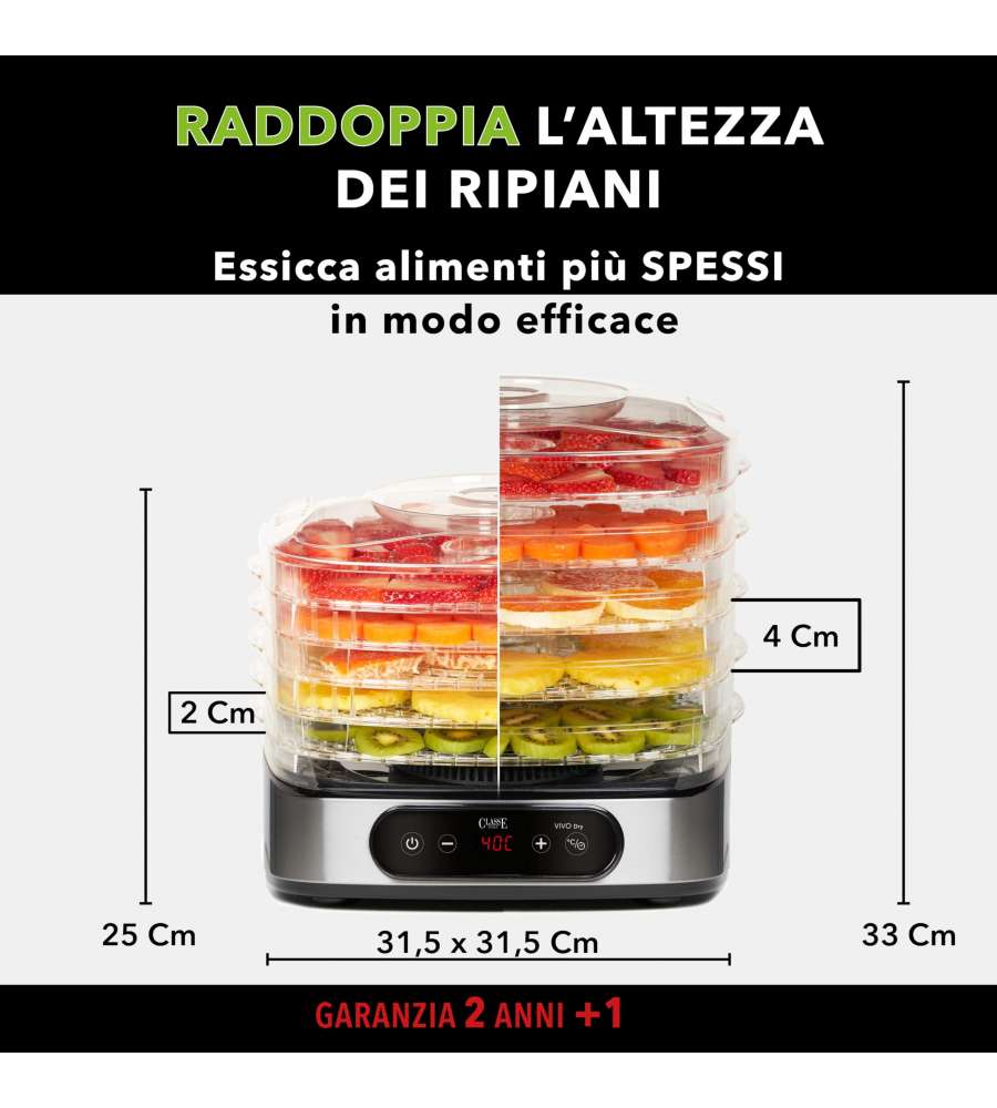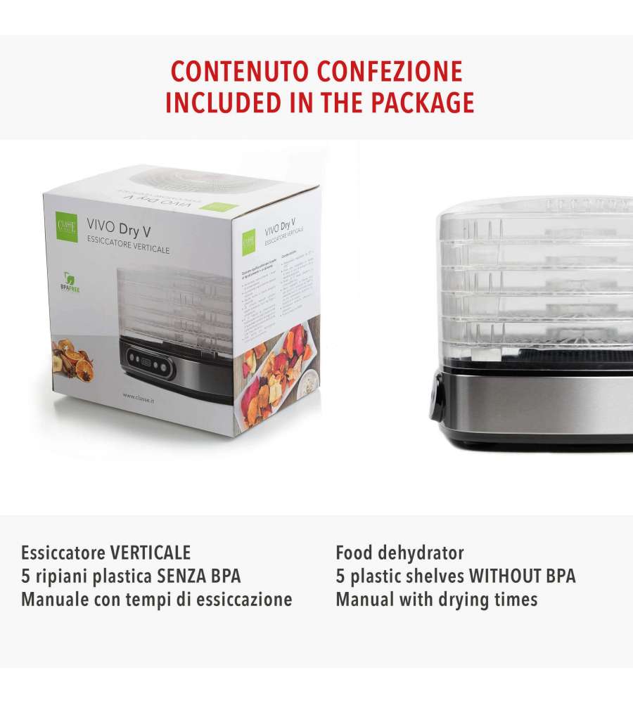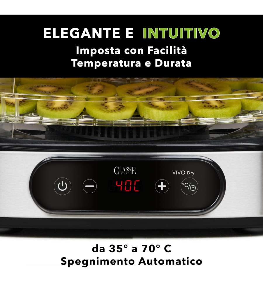 Descrizione: Scopri l'Essiccatore Verticale Dry V Vivo da 500W: struttura in acciaio, 5 cassetti in plastica con altezza regolabile e termostato. Ideale per essiccare funghi, frutta e verdura. Dotato di display digitale e comandi integrati.