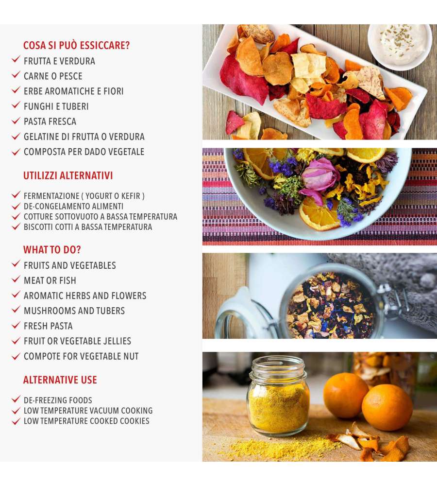 Questo essiccatore è perfetto per chi desidera conservare alimenti in modo naturale, mantenendo intatti i sapori e le proprietà nutritive. Grazie alla sua struttura in acciaio e ai cassetti regolabili, offre una grande versatilità e praticità. Il termostato e il display digitale permettono un controllo preciso della temperatura, garantendo risultati ottimali per ogni tipo di alimento. Consigliato per chi ama preparare snack sani e naturali.