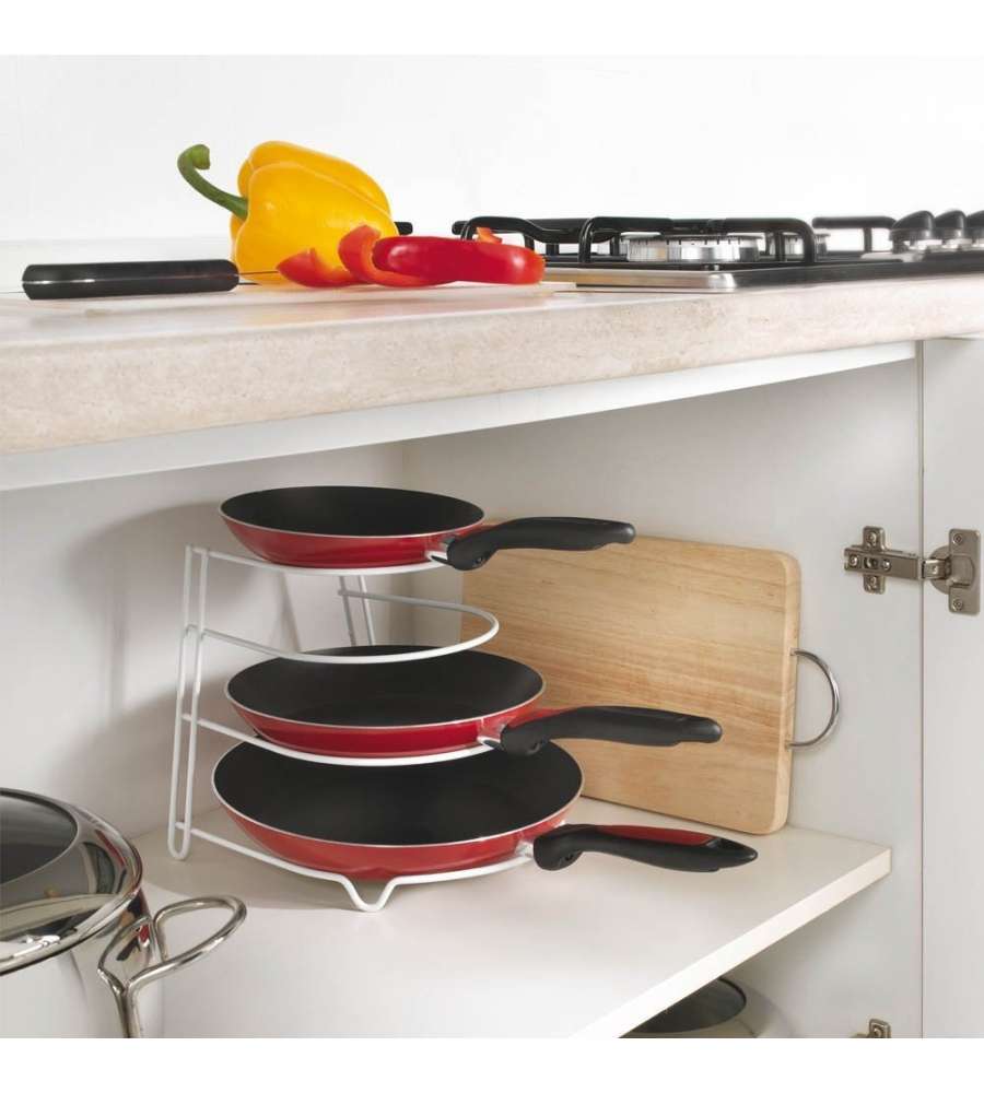 Mensola porta padelle in filo di ferro plastificato Polytherm, colore bianco. Design moderno e regolabile, resiste alla ruggine. Dimensioni: 23x27x23 cm, capacità 4 padelle. Ideale per tenere tutto ordinato su piani di lavoro.Capacità: