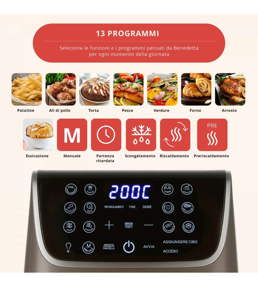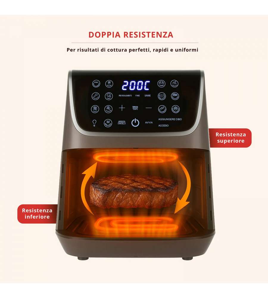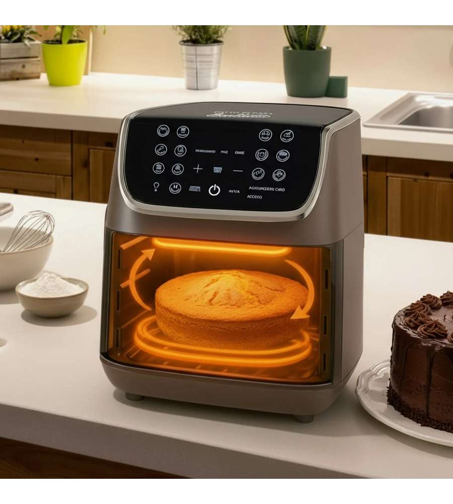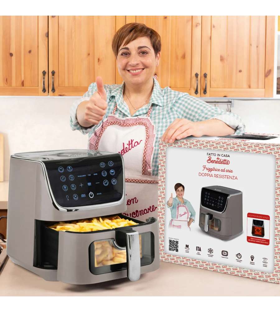 Descrizione: Scopri la friggitrice ad aria doppia resistenza da 6,5 L di FATTO IN CASA da Benedetta, perfetta per cotture uniformi di dolci e panificati. 13 programmi intuitivi, partenza ritardata e finestra di controllo!