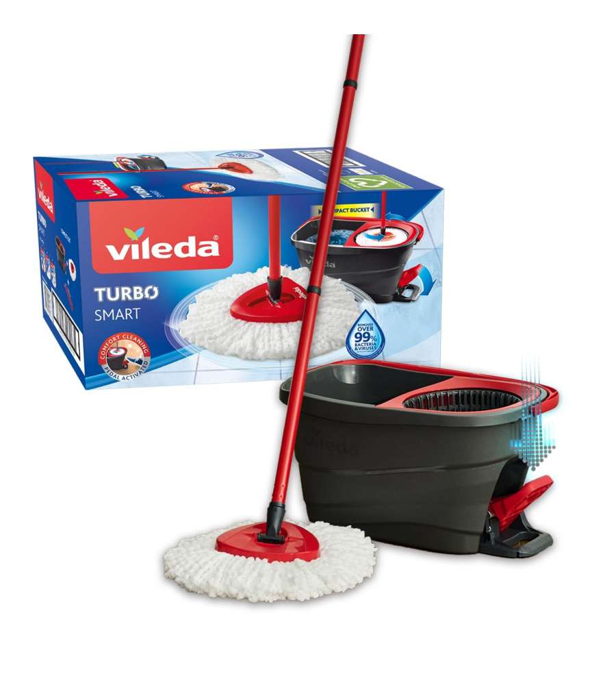 Descrizione: Scopri il Kit pulizia Turbo Smart Vileda: secchio ergonomico, mop in microfibra e sistema strizzatore a pedale per una pulizia efficace su ogni superficie, da laminato a parquet.