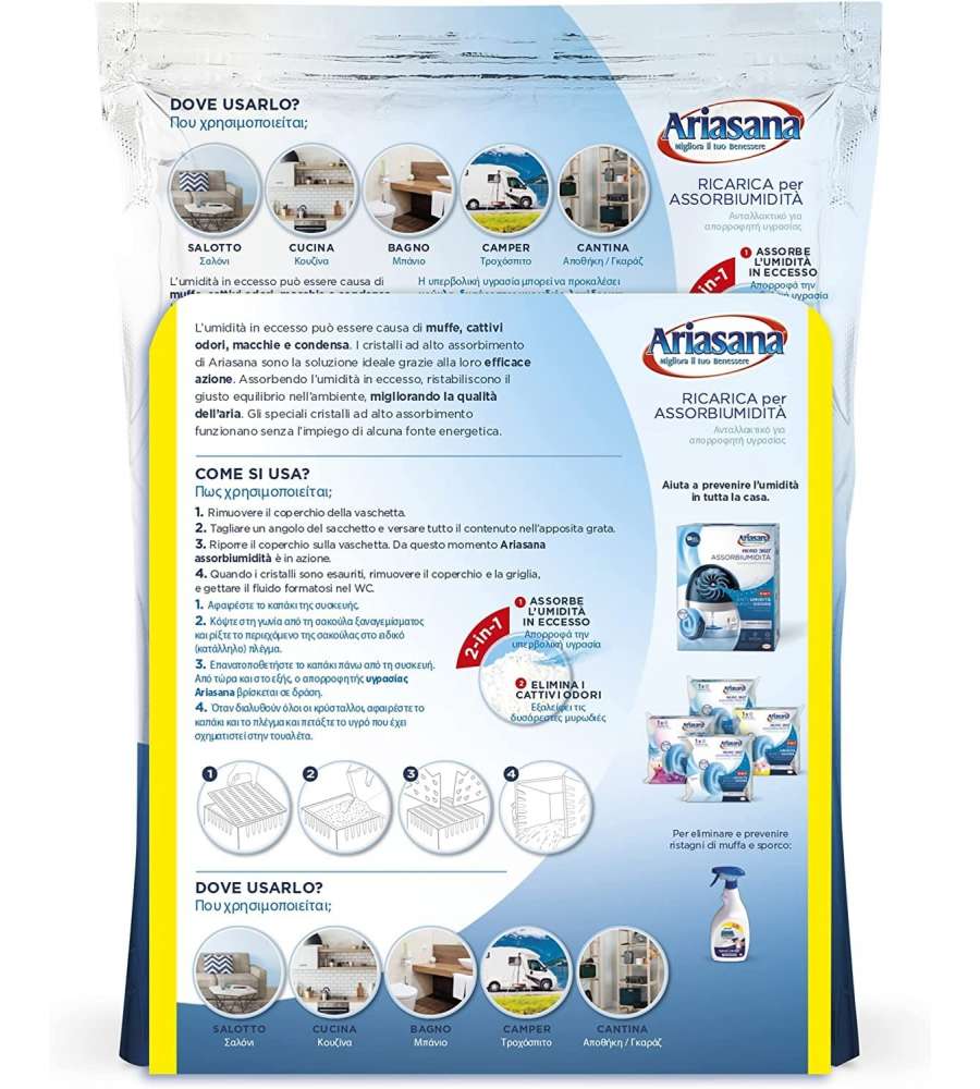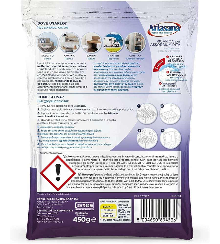 Ariasana Ricarica Assorbiumidità rappresenta la soluzione ideale per combattere l'umidità e i cattivi odori in casa. Grazie alla sua formulazione in cristalli, riesce ad assorbire efficacemente l'umidità presente negli ambienti, rendendoli più salubri e gradevoli. Questo prodotto è particolarmente indicato per l'uso in bagni e in spazi mal isolati, dove l'umidità tende a accumularsi. La profumazione alla lavanda offre un'atmosfera fresca e rilassante, perfetta per ogni ambiente domestico. Inoltre, la busta in alluminio garantisce che i cristalli rimangano freschi e attivi fino al momento dell'uso, assicurando la massima efficacia.