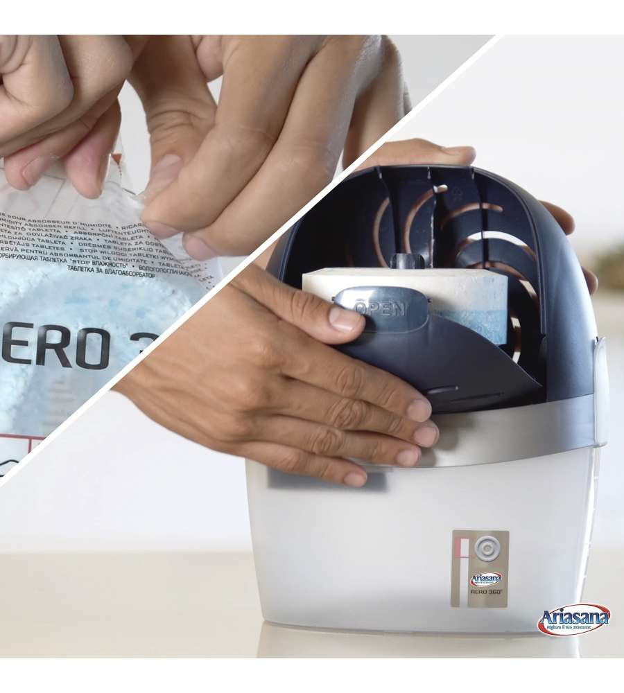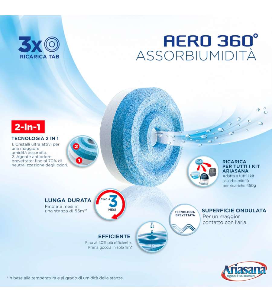 Descrizione: Ricarica Ariasana per deumidificatori: confezione da 3 x 450g di cristalli assorbenti ultra-efficaci per combattere l'umidità in ambienti fino a 55 m³. Formula ecosostenibile con agenti anti-odore. Universali.