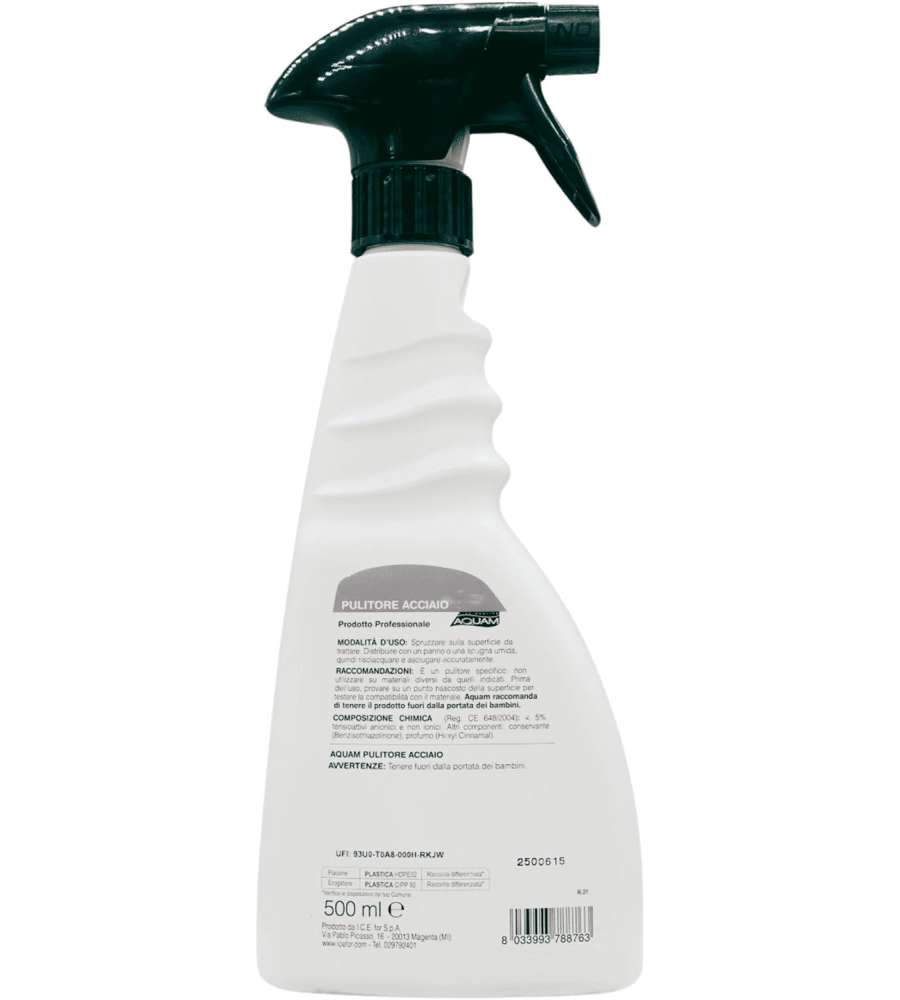 Descrizione: Pulitore acciaio spray Aquam da 500ml, ideale per superfici inox lucido e satinato. Formula anti-graffio con risciacquo rapido, rimuove aloni e macchie, garantendo brillantezza duratura.