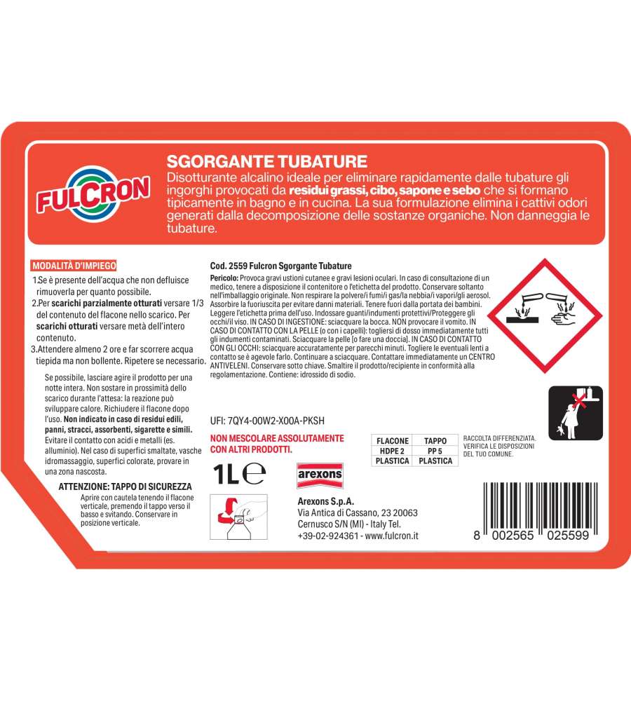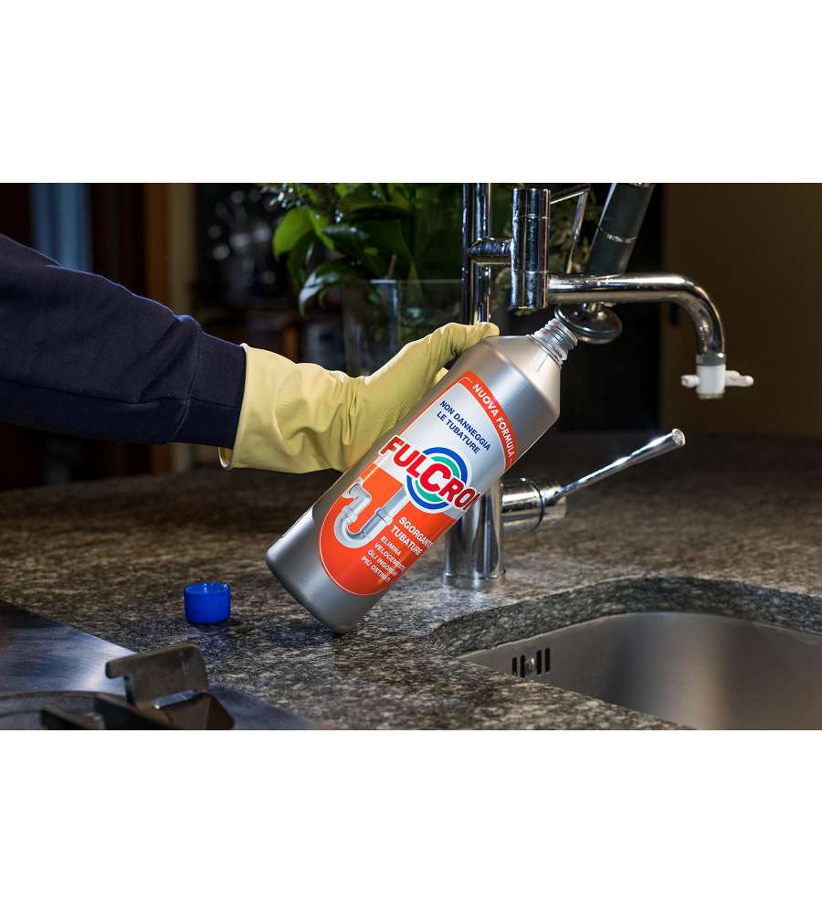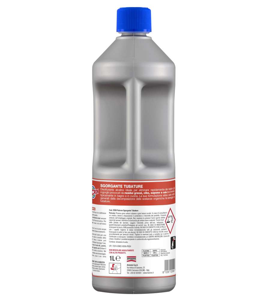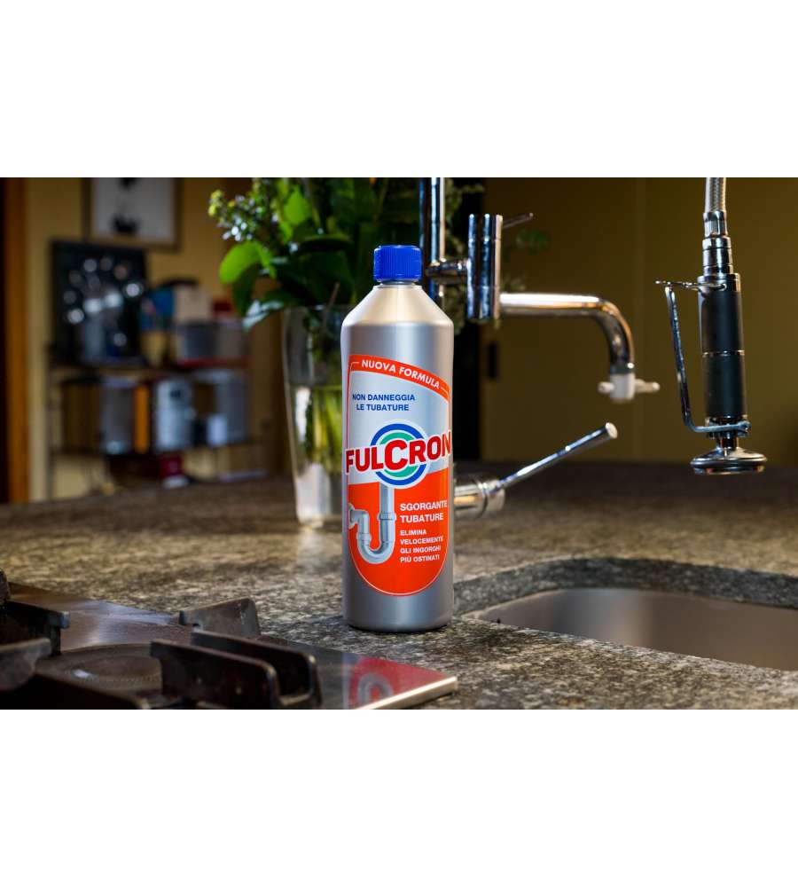 Sgorgante tubature Fulcron, efficace contro grasso, calcare e capelli. Formula liquida alta densità che penetra anche in acqua stagnante. Utilizzabile in WC, lavandini e docce, lascia gli scarichi puliti. Attendere 2-4 ore.Capacità :