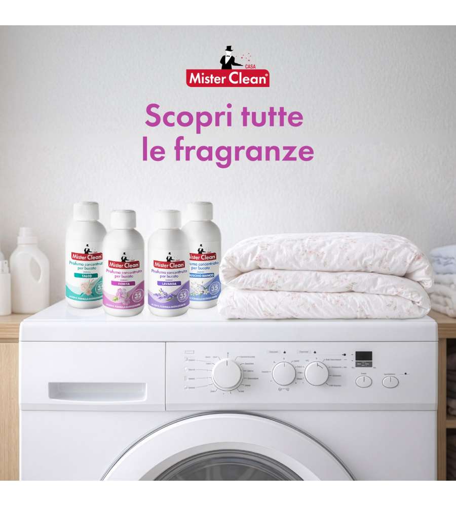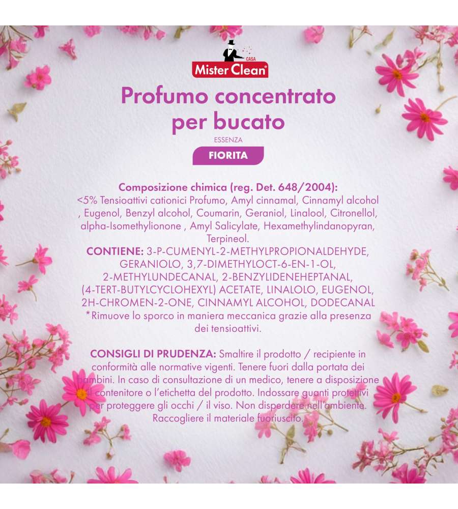 Mister Clean Profumo Concentrato Bucato Essenza Fiorita è l'alleato perfetto per chi desidera un bucato non solo pulito, ma anche avvolto in una fragranza floreale che dura nel tempo. Grazie alla sua formula concentrata, è possibile ottenere risultati ottimali con una quantità minima di prodotto, rendendo ogni lavaggio un'esperienza sensoriale unica. Perfetto per chi ama circondarsi di freschezza, questo detersivo è adatto a tutti i tipi di tessuti, garantendo un'azione delicata ma efficace. Utilizzalo per ogni lavaggio e scopri come i tuoi capi possono trasformarsi in un vero e proprio bouquet di profumi.