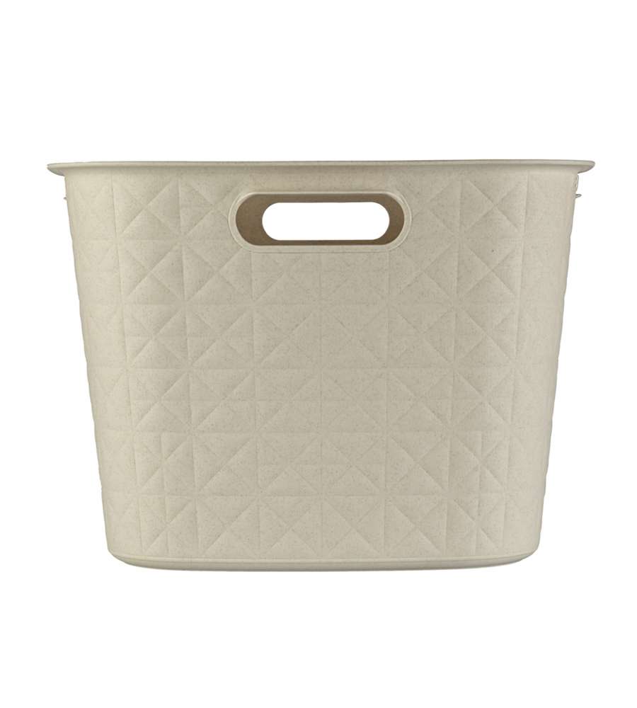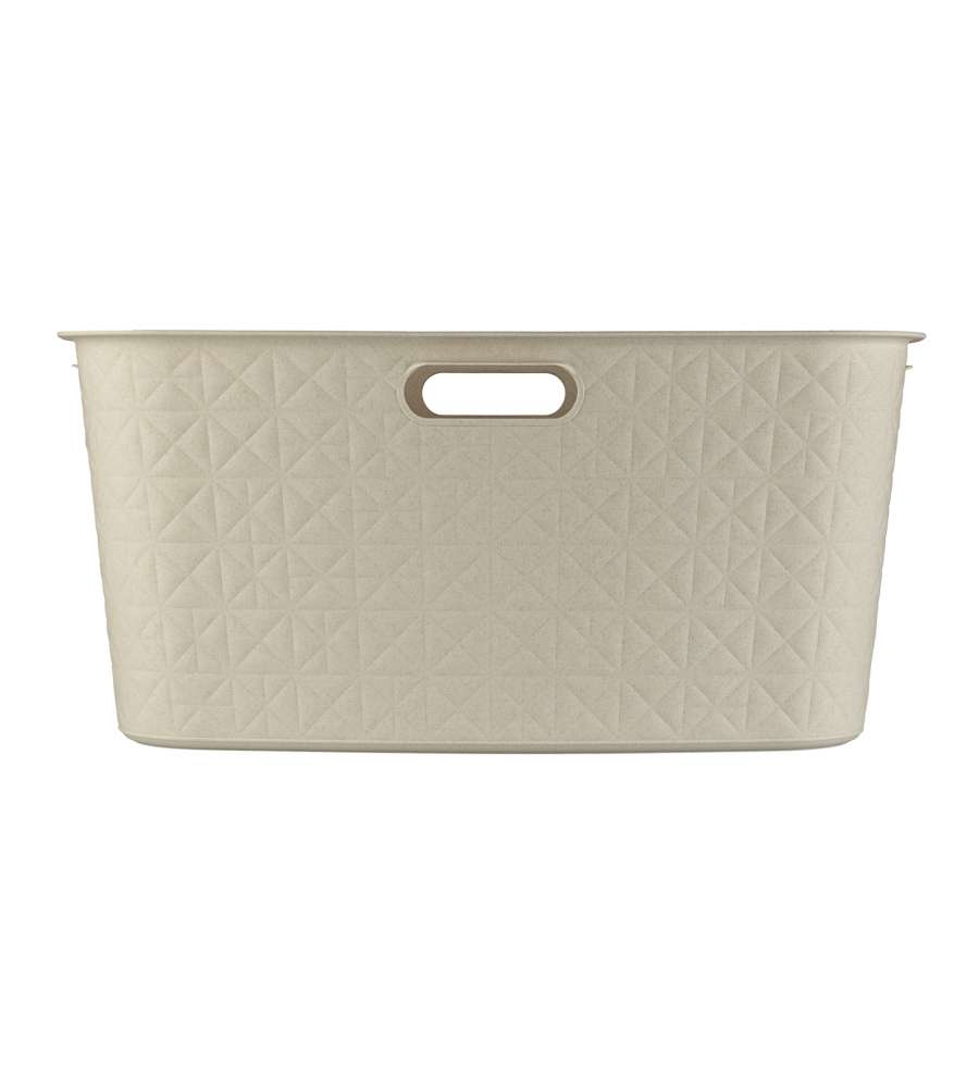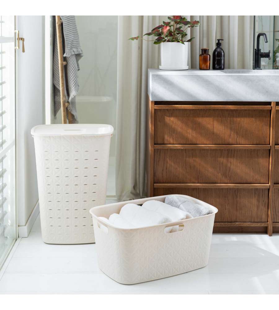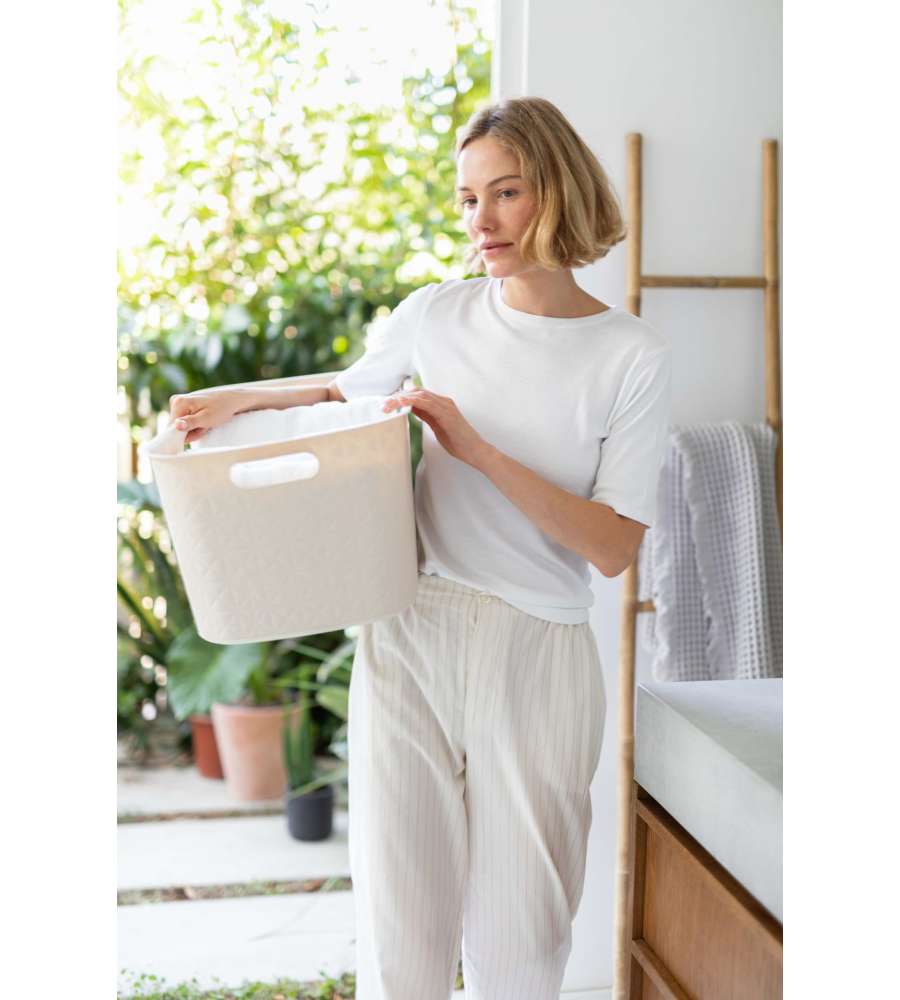 Cesta portabiancheria in bianco gesso con effetto trapuntato, dimensioni 39,7x59,4x27,4 cm, capacità 45 litri. Dotata di pratiche maniglie, ideale come contenitore multiuso per organizzare spazi.Capacità: