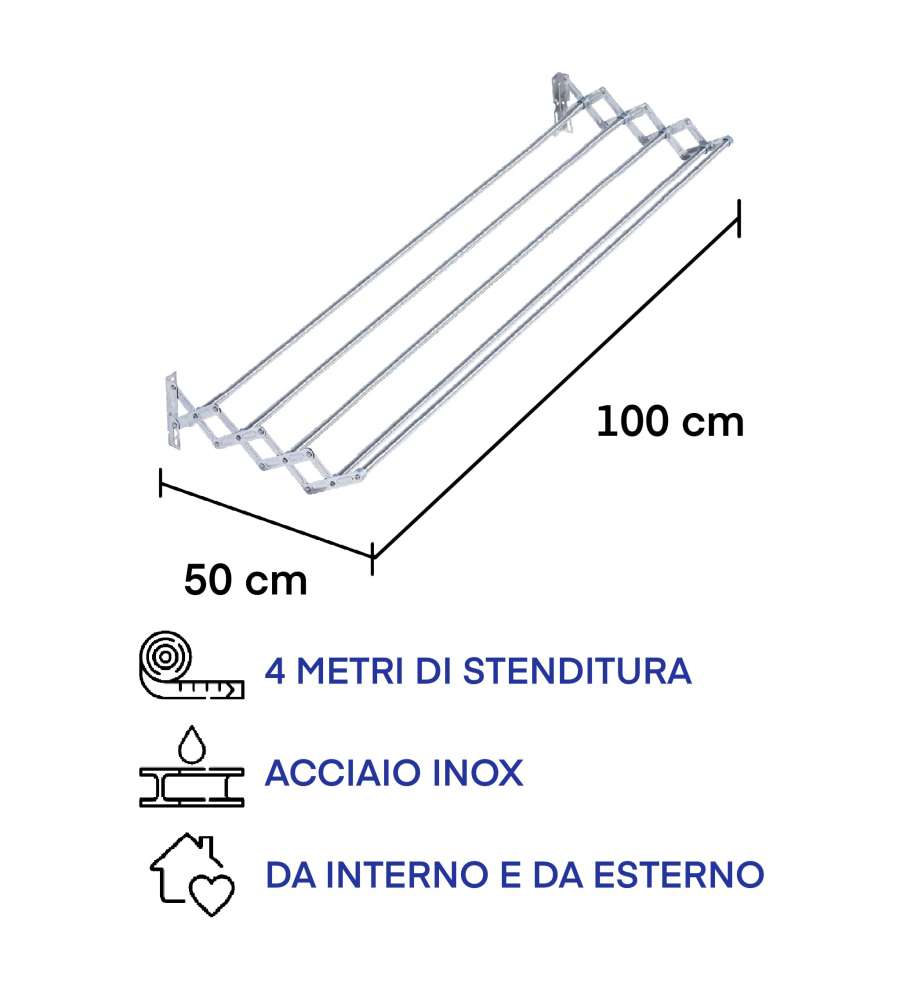 Stendipanni fisarmonica in acciaio inox, misura 100 cm. Chiusura pantografo per minimo ingombro, robusto e resistente alla ruggine. Fissaggio a parete, ideale per uso interno ed esterno. Include istruzioni per il montaggio.Uso esterno: