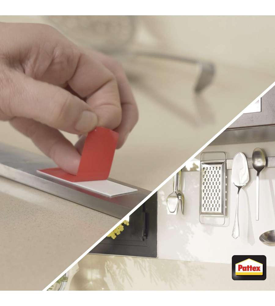 Nastro biadesivo extraforte Pattex Millechiodi, 19 mm x 1,5 m. Supporta fino a 120 kg, resistente da -40°C a +90°C. Adatto per interni ed esterni, versatile su varie superfici. Ideale per applicazioni permanenti senza forare.Portata massima: