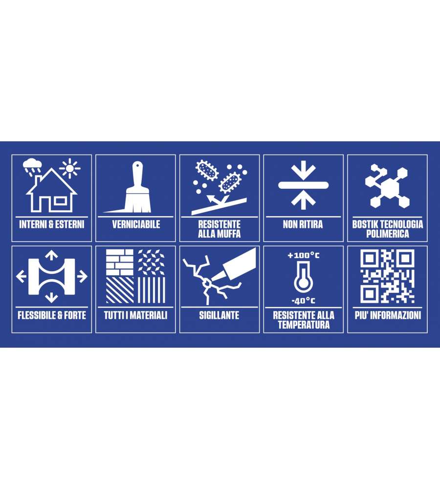 Sigillante universale Bostik Poly Max, elastico, verniciabile e antimuffa. Ideale per sigillature impermeabili in ambienti sanitari e cucine, ottima adesione a vari materiali. Facilità di applicazione e riempimento senza ritiro.Uso esterno: