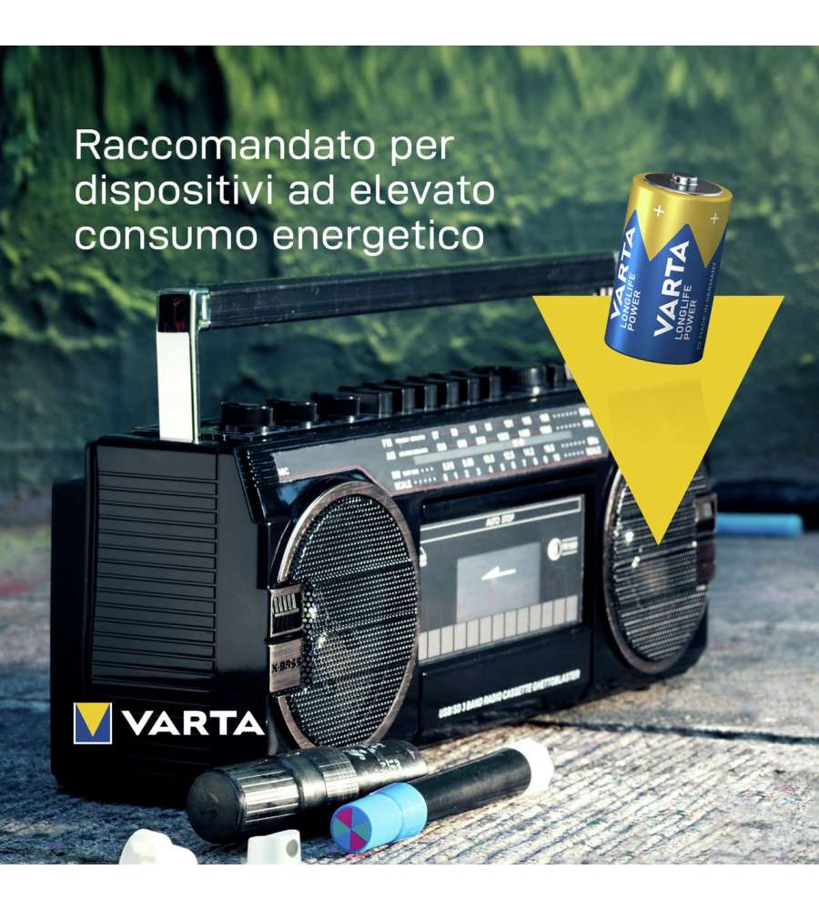 Descrizione: Batterie Varta D Longlife Power, set da 2 pezzi per dispositivi ad alto consumo energetico. Alta capacità, durata prolungata e resistenza certificata. Ideali per giochi, radio e lampade da campeggio. Affidabilità tedesca!