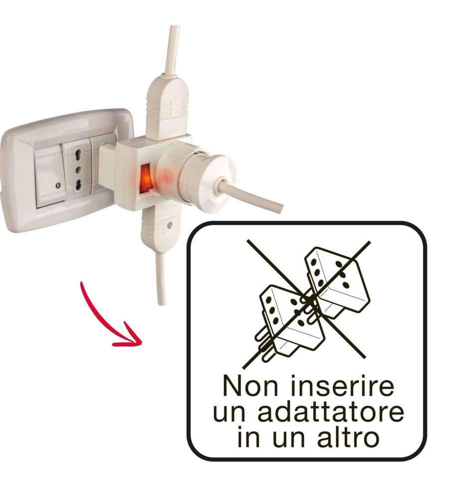 Adattatore 3 prese con interruttore di sicurezza, spina 10A, 1 presa pluristandard 10/16A e 2 prese 10-16A. Colore bianco, dimensioni 7x8x5 cm, peso 37 g. Certificato CE, ideale per dispositivi standard italiani e tedeschi.Made in Italy: