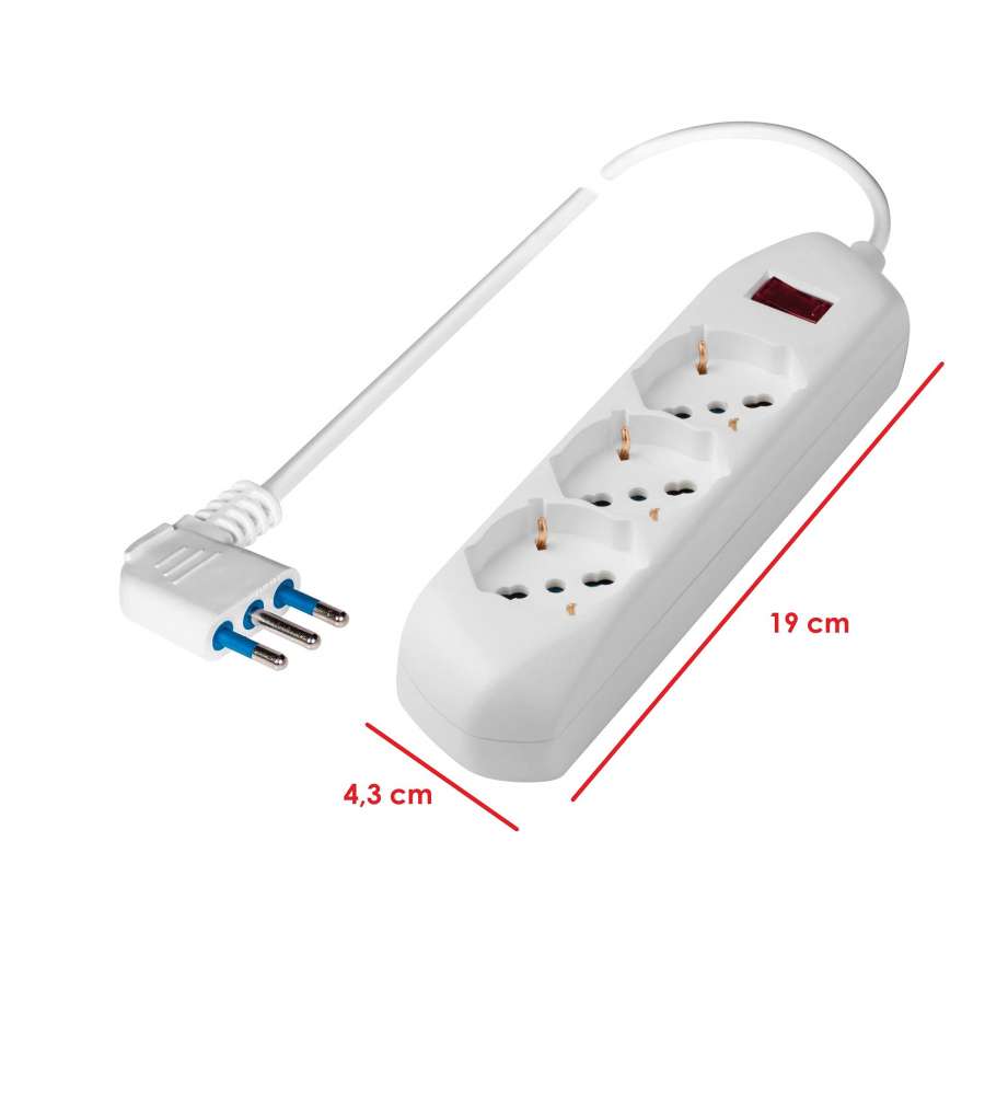 Presa tripla bianca 10/16A 2P+T. 1,5m cavo H05VV-F 3 X 0,75mm², 3 prese pluristandard inclinate per facilitare l'inserimento di spine ingombranti. Interruttore di sicurezza, potenza massima 2300W, certificazione CE. Ideale per uso domestico.Destinazione d'uso: