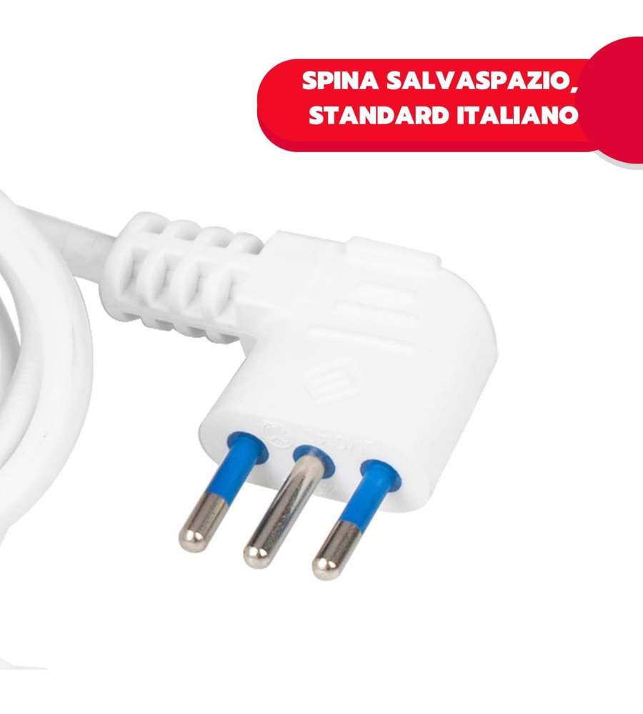 Prolunga elettrica 10m, 250V, con presa pluristandard 10/16A e spina salvaspazio. Dotata di interruttore di sicurezza per sovraccarico, cavo H05VV-F 3x1mm² e risparmio energetico. Colore bianco, ideale per dispositivi italiani e tedeschi.Destinazione d'uso: