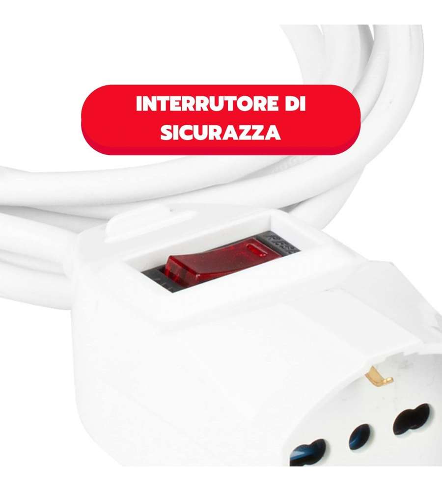 Descrizione: Prolunga elettrica da 10 metri con presa pluristandard e interruttore di sicurezza, ideale per dispositivi italiani e tedeschi.